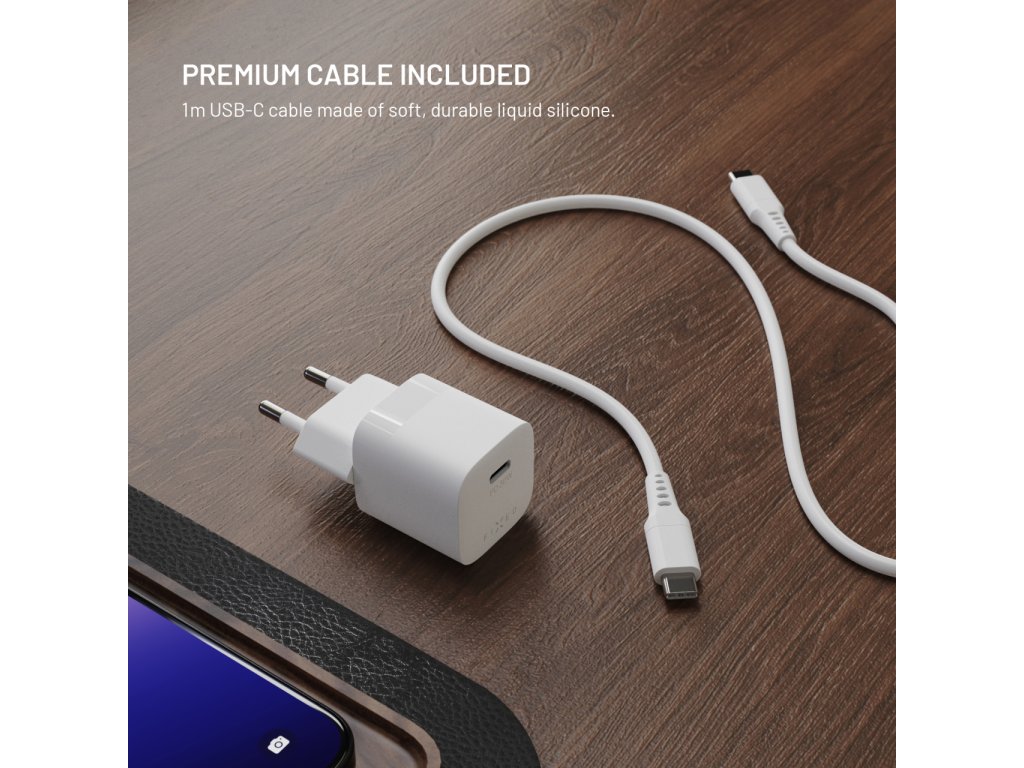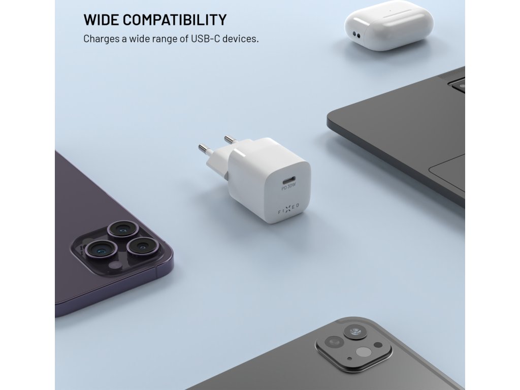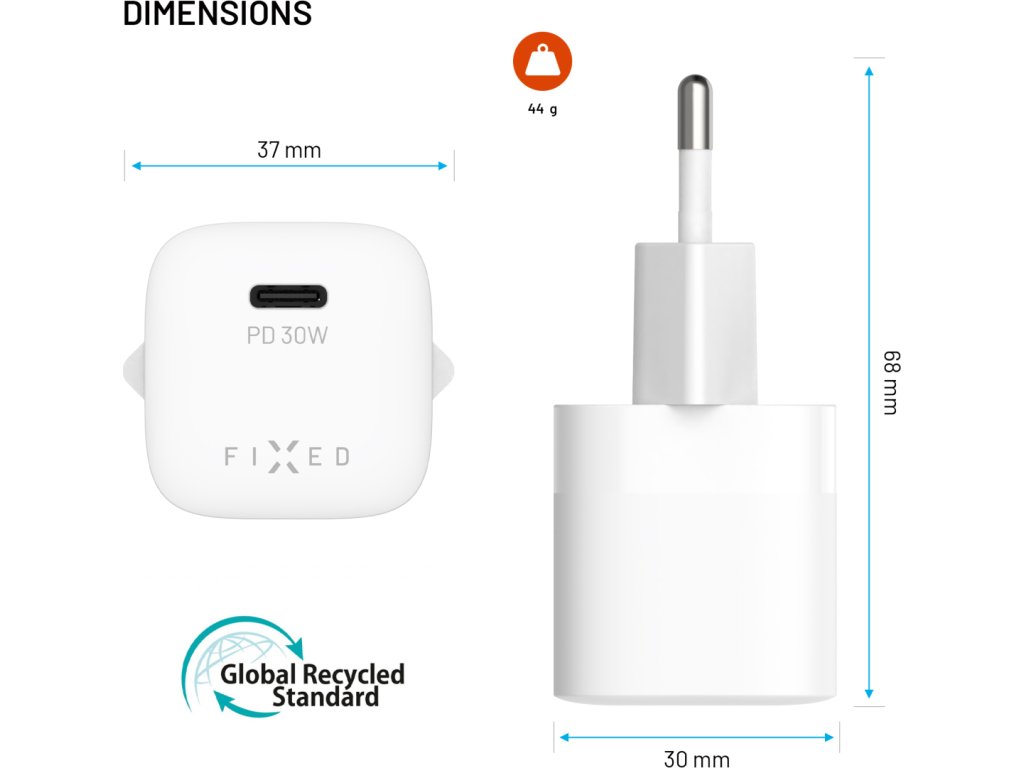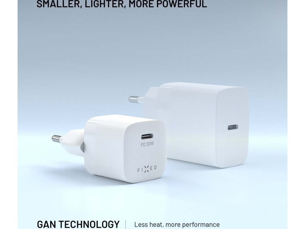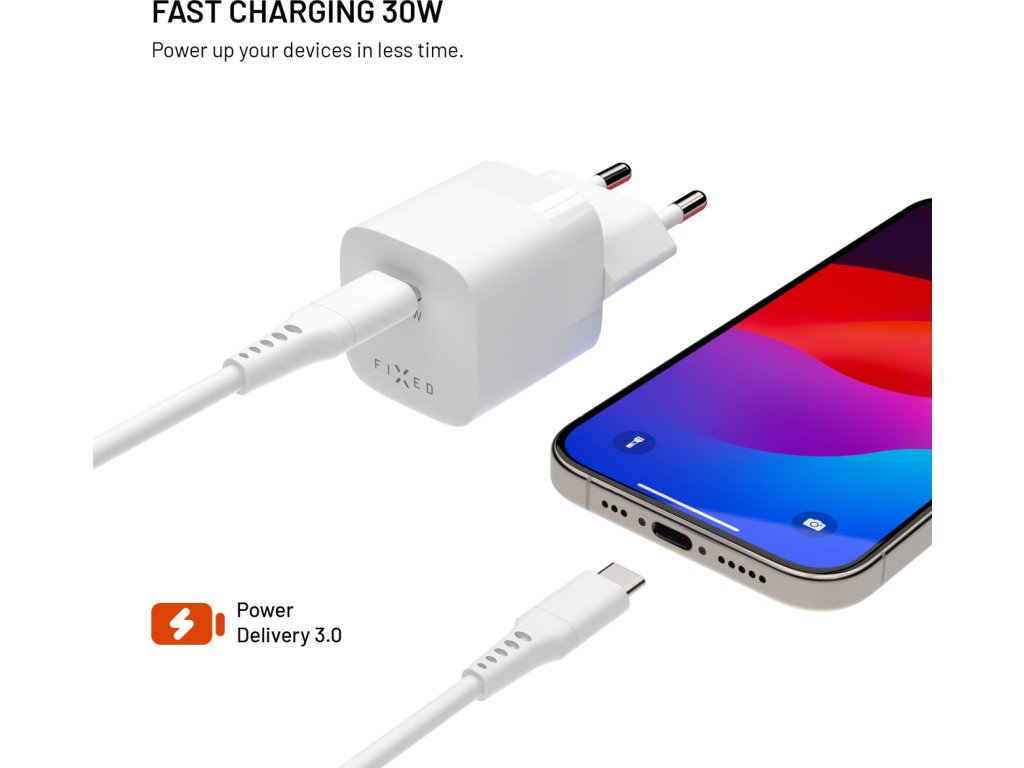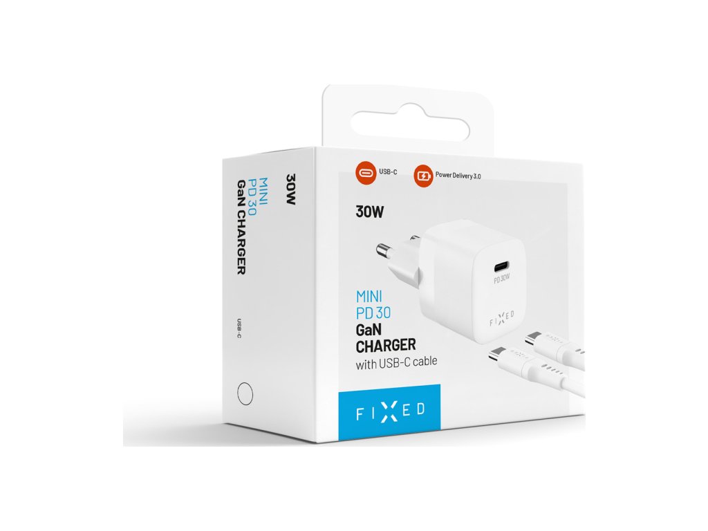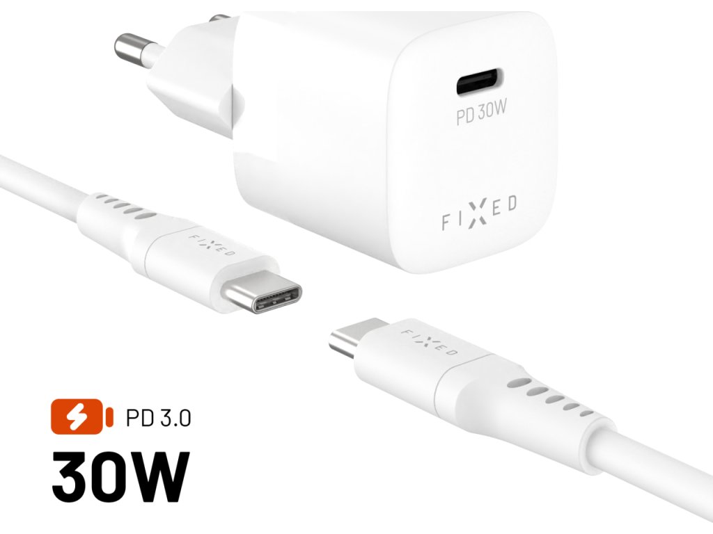 Set síťové GaN nabíječky FIXED Mini s USB-C výstupem a USB-C/USB-C kabelu, podpora PD, 1,2 metr, 30W, bílý