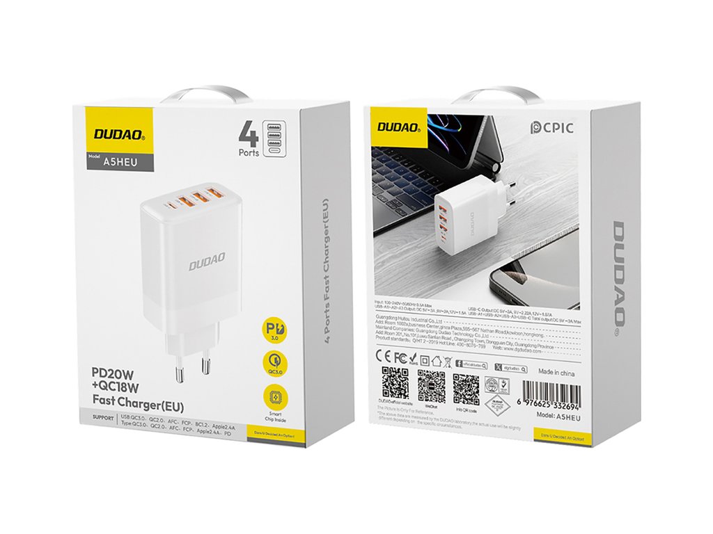 Nabíječka do zásuvky Dudao A5HEU je vybavena třemi porty USB-A a jedním portem USB-C, což umožňuje nabíjet až čtyři zařízení současně. Díky pokročilým protokolům rychlého nabíjení, jako jsou Power Delivery a Quick Charge 3.0, nabijete svá zařízení okamžitě. Je nejen odolná, ale také bezpečná – je vyrobena z odolných materiálů PC a ABS. Díky kompaktnímu designu je navíc ideálním společníkem na cesty.