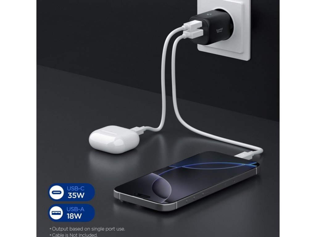 Spigen Essential EE352EU je kompaktní a efektivní síťová nabíječka GaN Pro určená pro rychlé a bezpečné nabíjení dvou zařízení současně. Díky dvěma portům – 35W USB-C a 18W USB-A – umožňuje flexibilní nabíjení chytrých telefonů, tabletů, sluchátek a dalšího příslušenství a zajišťuje optimální výkon pro každé připojené zařízení.