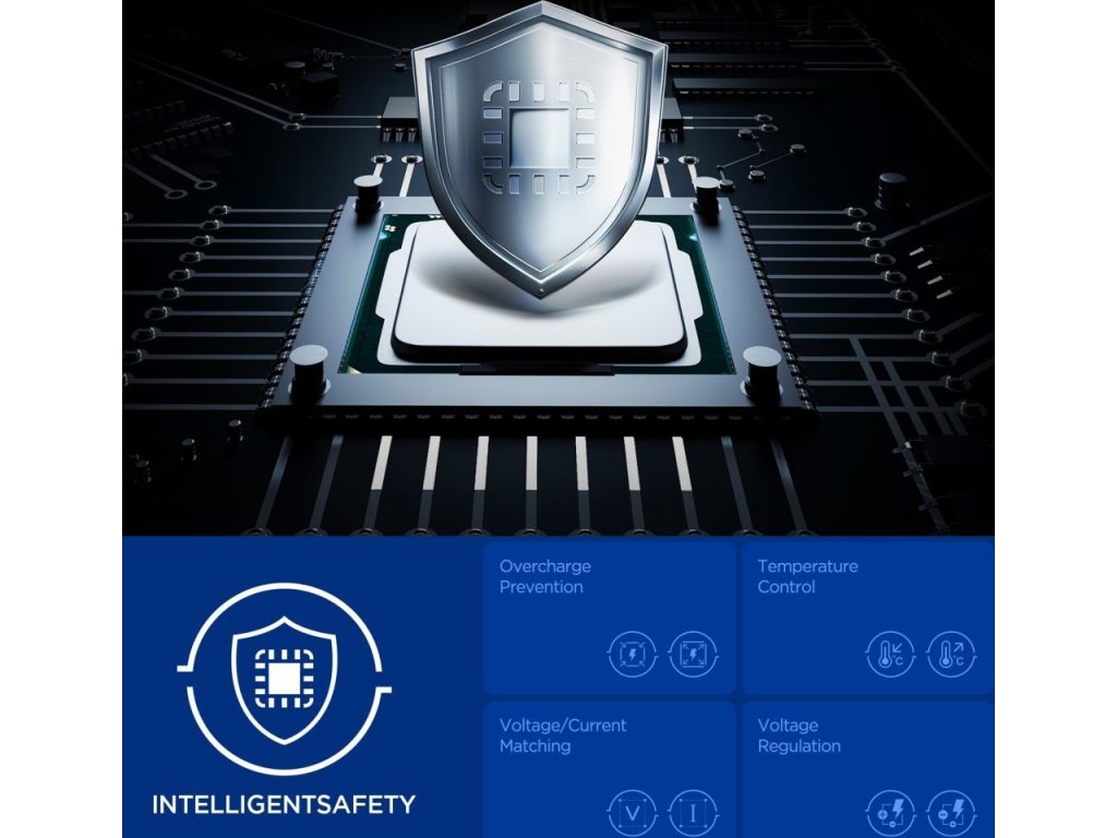 Technologie Quantum Boost automaticky upravuje nabíjecí výkon tak, aby odpovídal připojeným zařízením, a maximalizuje tak jejich účinnost. Vestavěné funkce prevence přebíjení, vyrovnávání napětí a regulace napětí chrání zařízení před přebíjením, nadměrným napětím a nestabilním proudem a zajišťují tak bezpečné a stabilní nabíjení za všech podmínek.