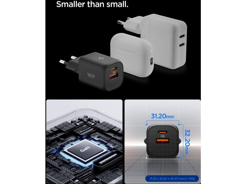 Spigen Essential EE202EU je kompaktní a efektivní síťová nabíječka GaN Pro určená pro rychlé a bezpečné nabíjení dvou zařízení současně.