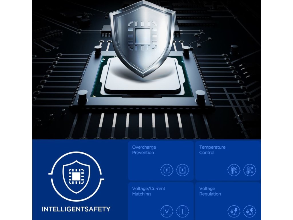 Technologie Quantum Boost automaticky upravuje nabíjecí výkon tak, aby odpovídal připojeným zařízením, a maximalizuje tak jejich účinnost. Vestavěné funkce prevence přebíjení, vyrovnávání napětí a regulace napětí chrání zařízení před přebíjením, nadměrným napětím a nestabilním proudem a zajišťují tak bezpečné a stabilní nabíjení za všech podmínek.