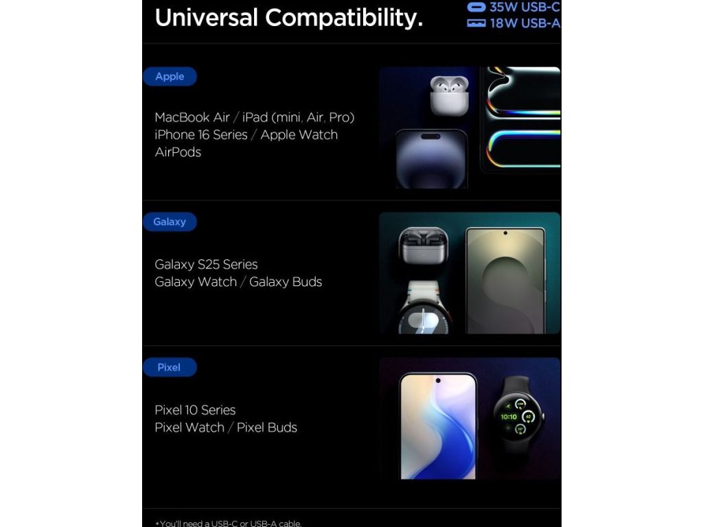 - Výstupní parametry: USB-C 5V/3A, 9V/3A, 12V/2,92A, 15V/2,33A, 20V/1,75A PPS 5V-11V/3A 35W Max