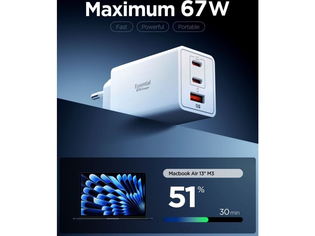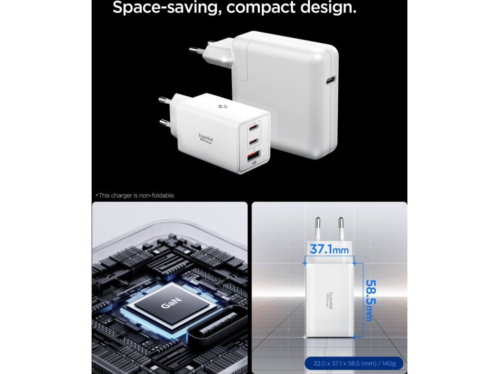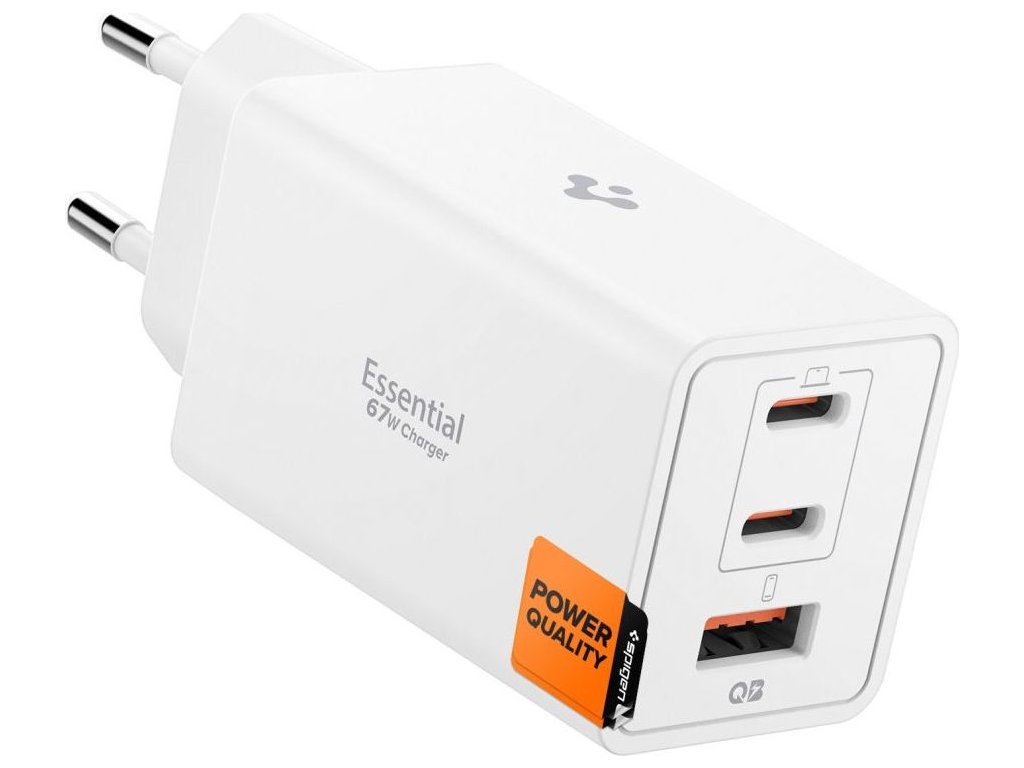 Spigen Essential EE673EU je všestranná nástěnná nabíječka s technologií GaN Pro, navržená pro současné nabíjení tří zařízení. Tři porty – dva porty USB-C s výkonem až 67 W a jeden port USB-A s výkonem až 22,5 W – umožňují flexibilně napájet chytré telefony, tablety a příslušenství a automaticky upravovat nastavení podle potřeb připojeného zařízení. Použití jednoho portu USB-C vám poskytne plný výkon 67 W a při kombinaci portů nabíječka inteligentně rozděluje energii pro optimální účinnost.