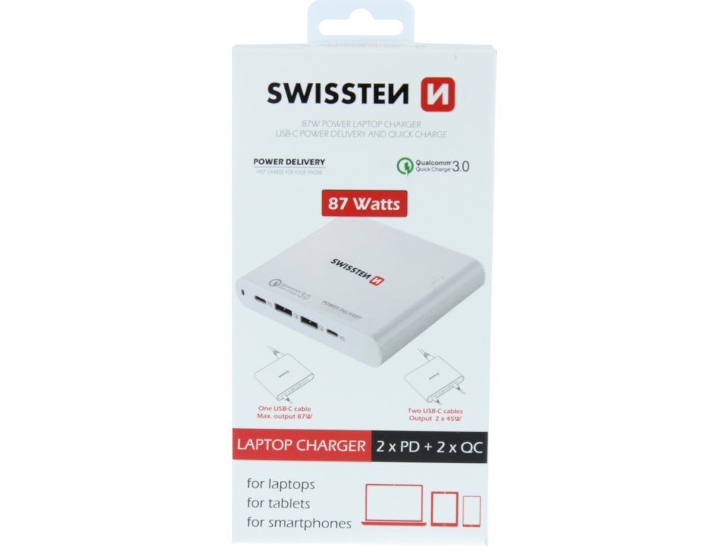 Síťový adaptér s výkonem 87W pro dobíjení Notebooků a MacBooků. Adaptér je vybavena výstupy 2XUSB-C s technologií rychlého nabíjení POWER DELIVERY pro zařízení s IOS a 2xUSB s rychlým nabíjením Qualcomm pro zařízení s OS Android .Baleno v blistru SWISSTEN.
