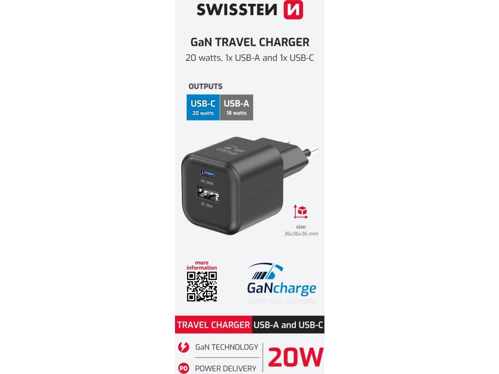 Nabíječka Swissten, max. výkon 20 Wattů, 1x USB-C / 1x USB-A QC 3.0, GaN technologie - efektivní nabíjení bez přehřívání, Ochrana proti zkratování, přepětí, přetížení nabíjení a vysoké teplotě, Malé rozměry. Baleno v blistru Swissten.