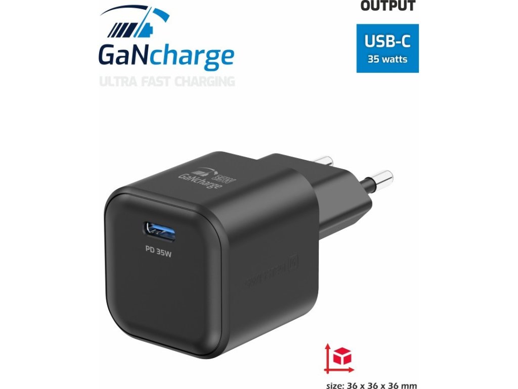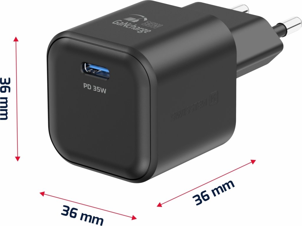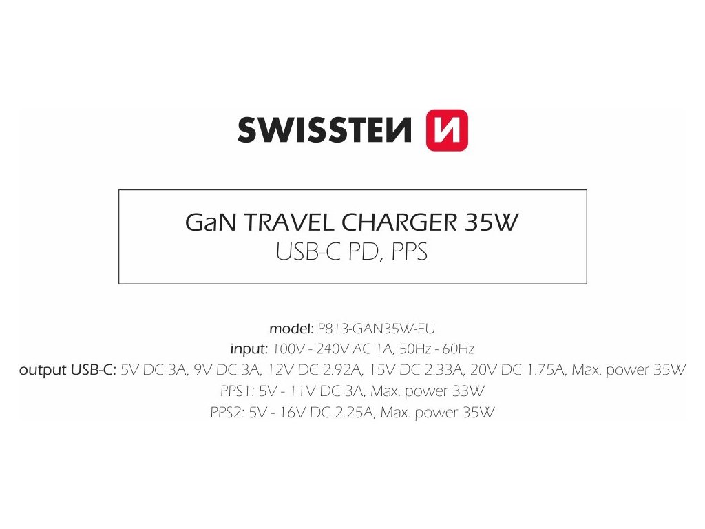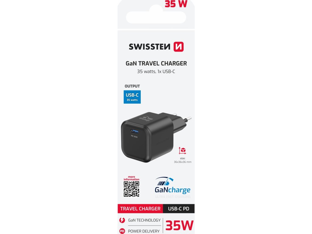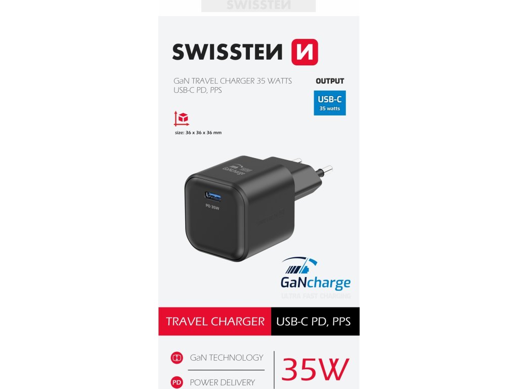Nabíječka Swissten, max. výkon 35 Wattů, 1x USB-C, GaN technologie - efektivní nabíjení bez přehřívání, Ochrana proti zkratování, přepětí, přetížení nabíjení a vysoké teplotě, Malé rozměry. Baleno v blistru Swissten.