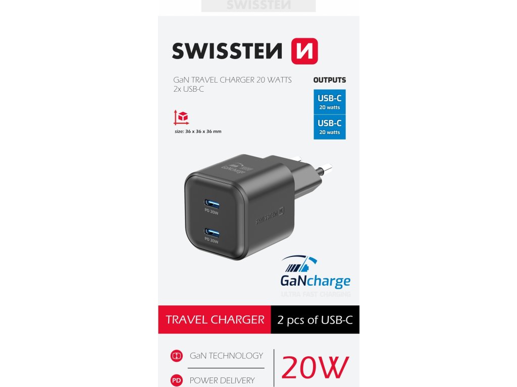 Nabíječka Swissten, Max. výkon 20 Wattů, 2x USB-C, GaN technologie - efektivní nabíjení bez přehřívání, Ochrana proti zkratování, přepětí, přetížení nabíjení a vysoké teplotě, Malé rozměry. Baleno v blistru Swissten.