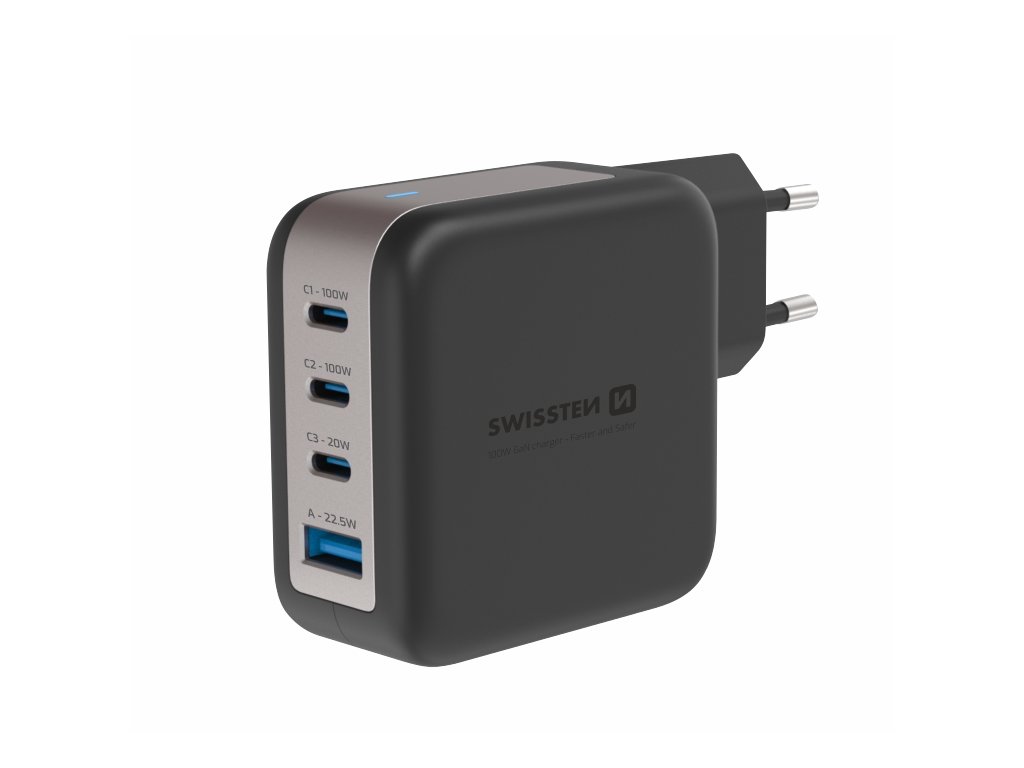 SWISSTEN SÍŤOVÝ ADAPTÉR GaN 3x USB-C 100W PD + 1x USB-A 18W QC ČERNÝ