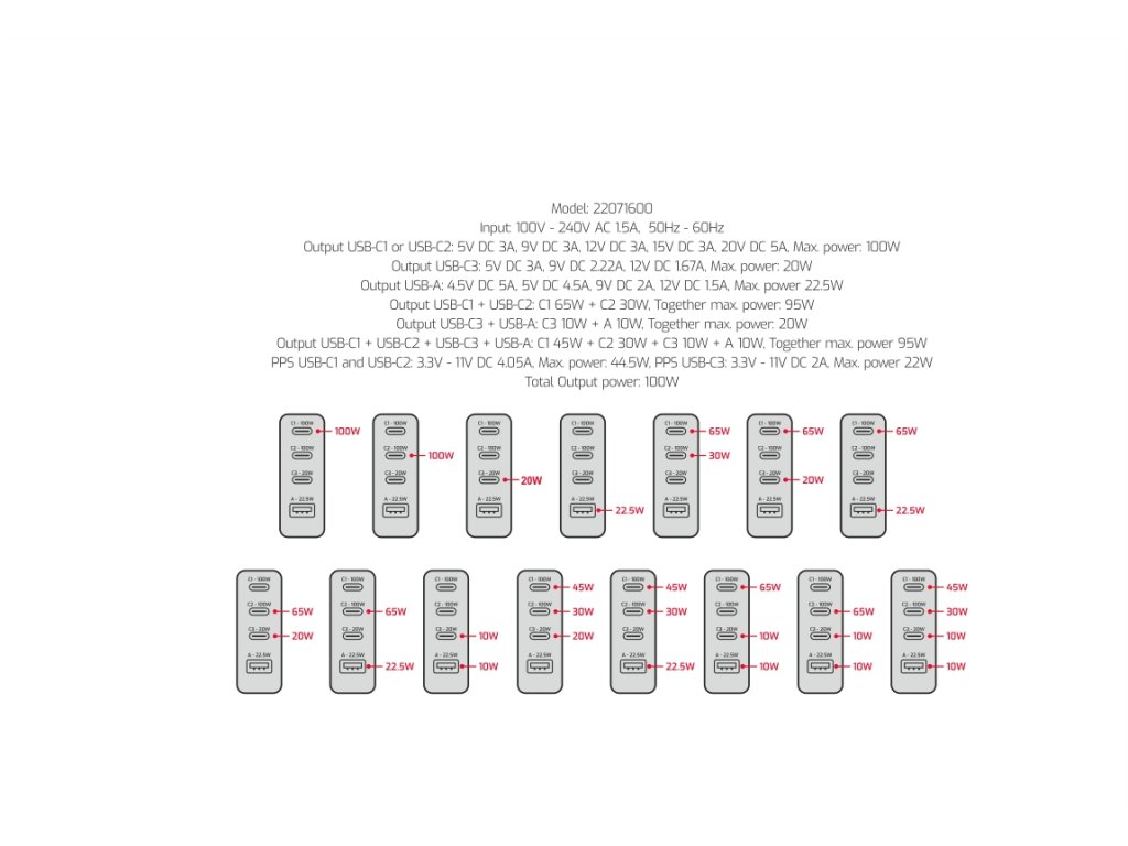 Společný výkon USB-C1 a USB-C2 a USB-C3 + USB-A: 45W + 30W + 20W / Max. 95W