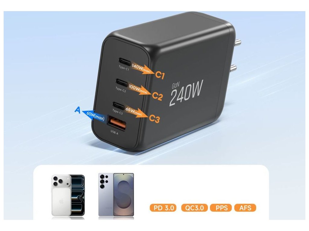 Nabíječka je vybavena třemi porty typu C a jedním portem USB-A a nabízí skvělou flexibilitu pro každodenní použití. Hlavní port typu C1 poskytuje 140 W s podporou 28 V, což je ideální pro nabíjení 16palcových MacBooků Pro a dalších náročných notebooků. Druhý port typu C2 nabízí 100 W, třetí port typu C3 poskytuje 65 W a port USB-A poskytuje 60 W s podporou Super Charge. Všechny čtyři porty mohou pracovat současně s inteligentním rozložením energie.
