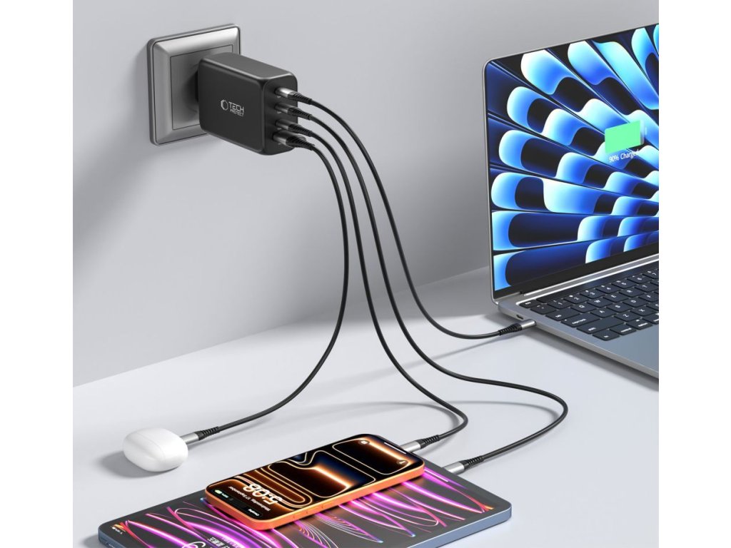 Nabíječka Tech-Protect NC240W-GAN AC je pokročilé zařízení využívající technologii GaN (nitrid galia) a nabízející výkon 240 W v kompaktním provedení. Díky čtyřem nabíjecím portům můžete současně napájet notebook, tablet, chytrý telefon a další příslušenství na plný výkon.