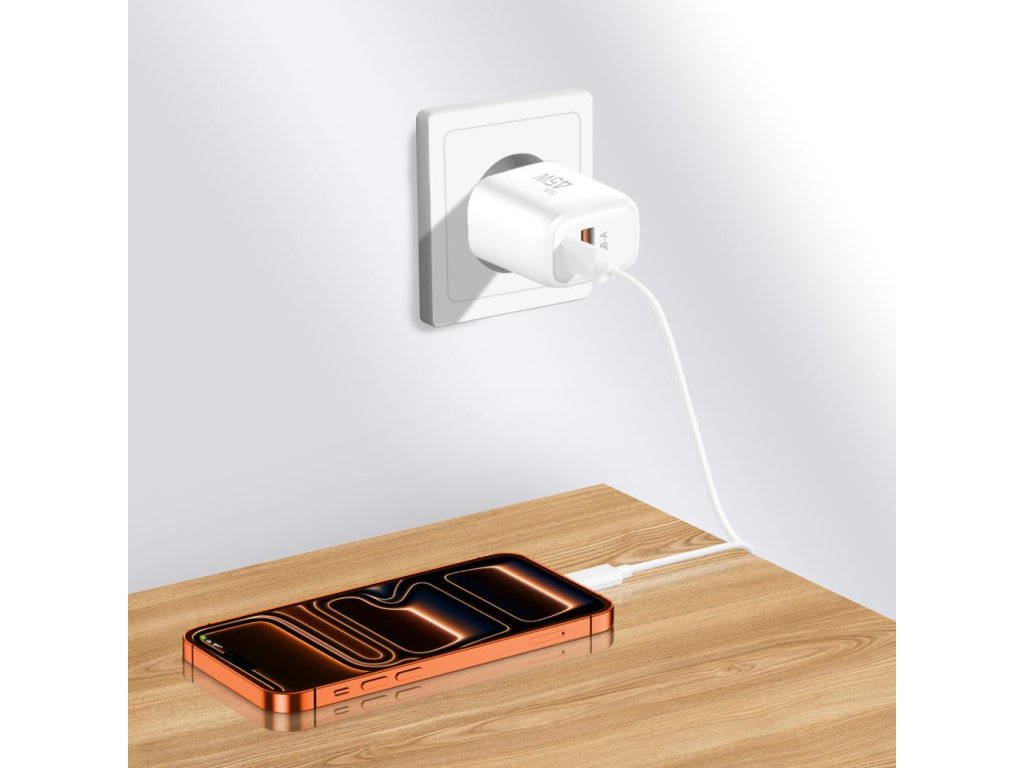Dudao A28PEU PD 45W GaN 2x USB-C nástěnná nabíječka - bílá Síťová nabíječka Dudao A28PEU je efektivní a moderní řešení pro rychlé nabíjení moderních mobilních a kancelářských zařízení.