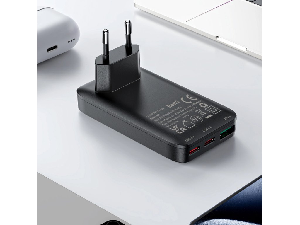 - Technologie GaN: Díky použití GaN (nitrid galia) je nabíječka menší, efektivnější a odolnější vůči přehřátí, což zajišťuje dlouhodobý a bezpečný provoz.