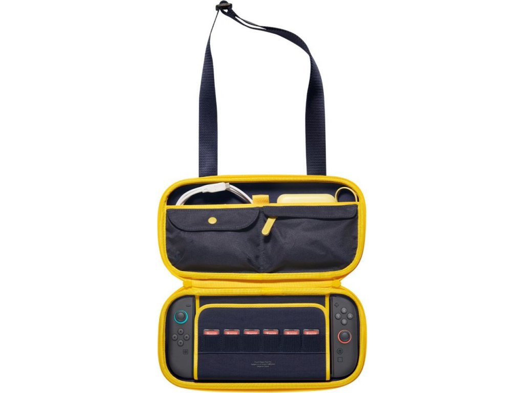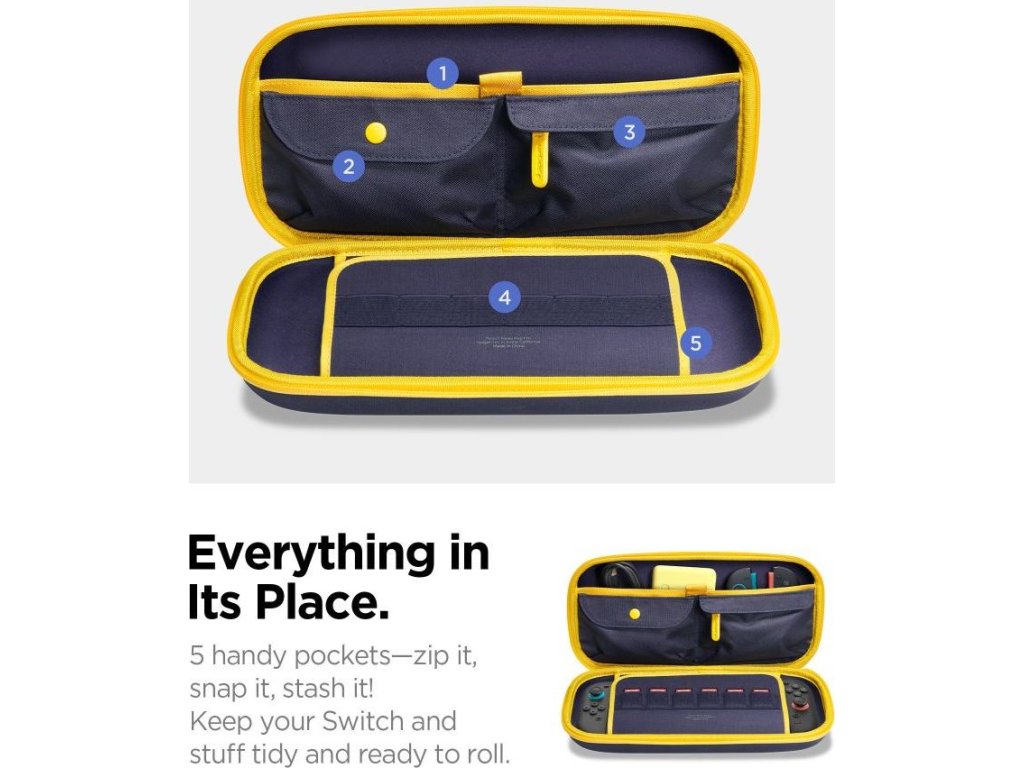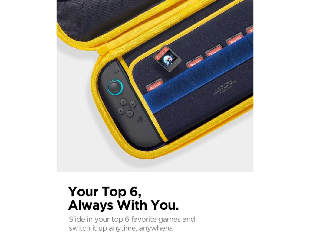 Pouzdro nabízí celkem pět praktických kapes: velkou zadní přihrádku ideální pro powerbanku nebo kabely, dvě menší kapsy na patentku a zip na drobné příslušenství nebo trackery, samostatnou kapsu pro samotnou konzoli a samostatný slot pro herní karty. Konzole je bezpečně držena na místě díky suchému zipu, který zabraňuje jejímu posunutí během přepravy, zatímco organizér na 6 herních karet eliminuje potřebu dalšího pouzdra.