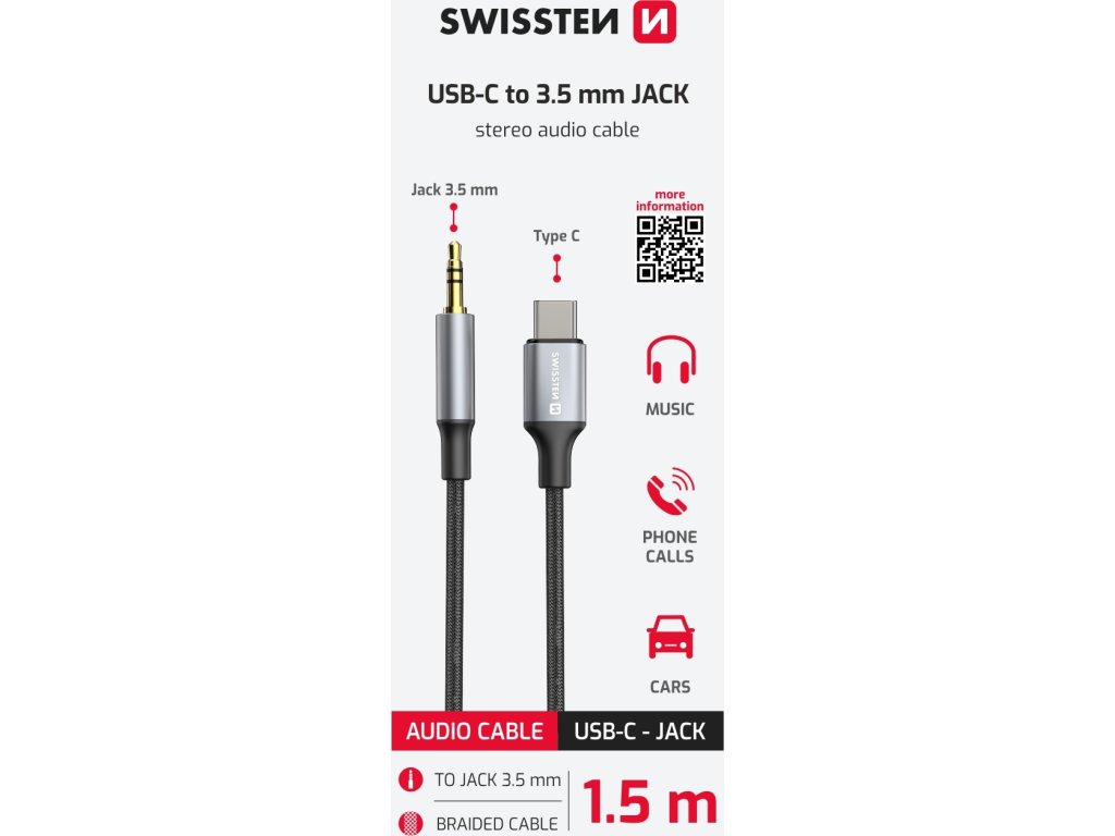 Audio adaptér SWISSTEN Textile USB-C (samec) / 3,5 mm JACK (samec), Délka: 1,5 m, Použití: Slouží pro propojení sluchátek a reproduktorů k zařízením s konektorem USB-C, Textilní materiál. Baleno v blistru SWISSTEN.