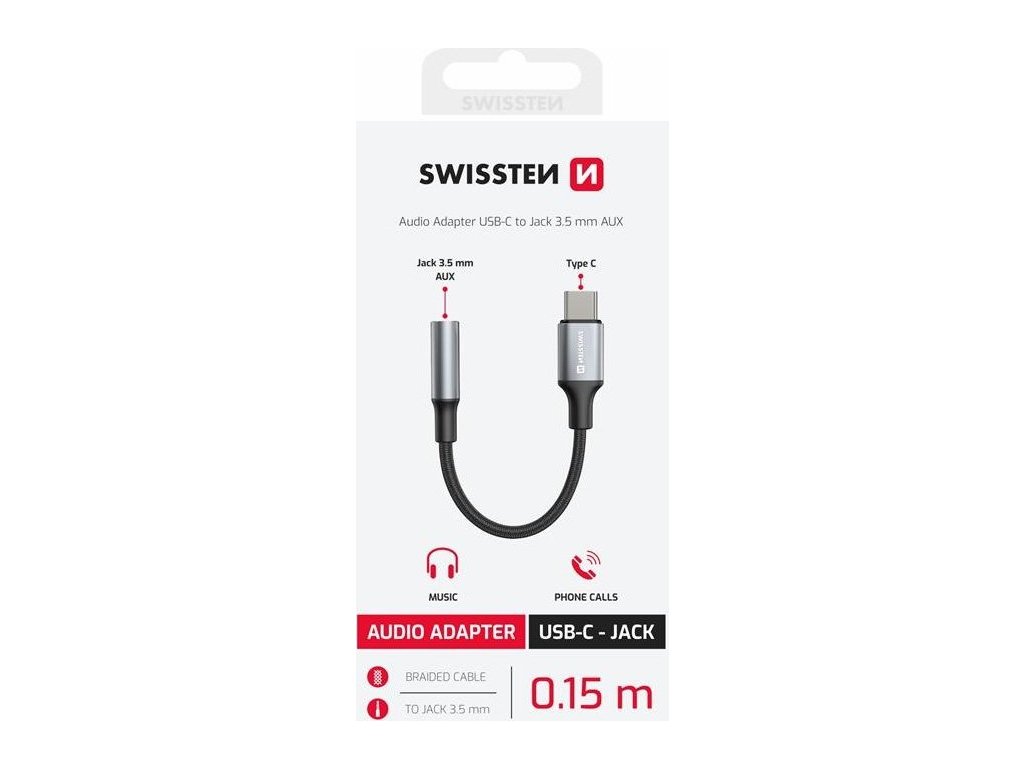 Audio adaptér SWISSTEN Textile USB-C (samec) / 3,5mm AUX, Délka: 15 cm, Využití: Pro připojení sluchátek a reproduktorů k chytrým zařízením bez klasického audio jack vstupu, Textilní materiál. Baleno v blistru SWISSTEN.