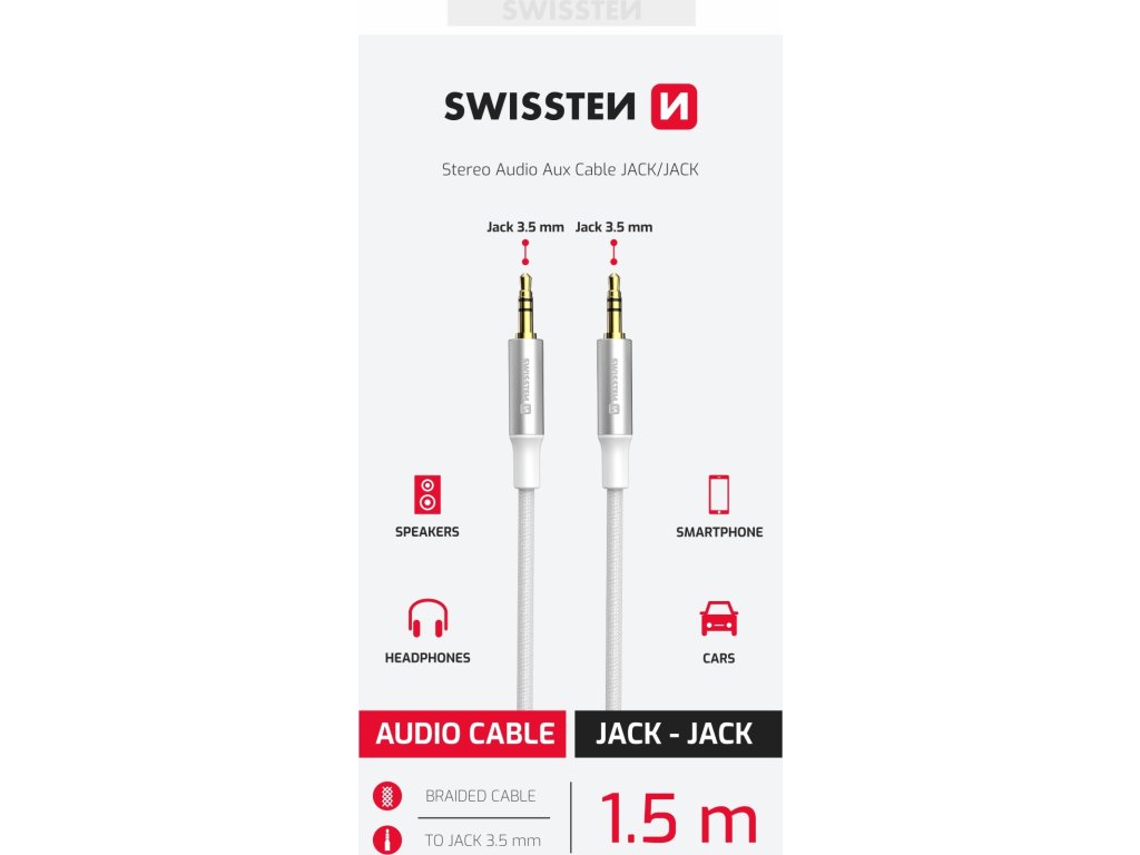 Audio kabel Swissten Textile JACK (samec) / JACK (samec), Délka: 1,5m, Využití: Propojení různých audio zařízení, jako jsou sluchátka, reproduktory nebo autorádia, Textilní materiál. Baleno v blistru SWISSTEN.