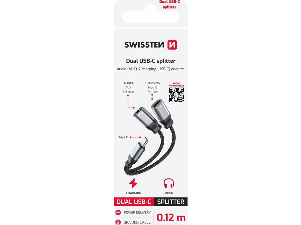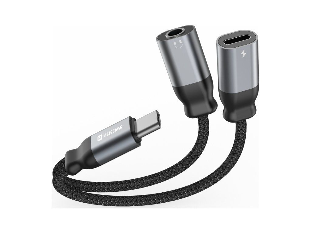 NABÍJECÍ AUDIO ADAPTÉR SWISSTEN TEXTILE USB-C (samec) / USB-C (samice) a 3,5mm AUX 0,12 M ČERNÝ