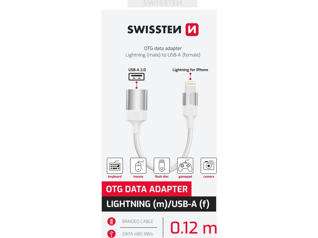 OTG adaptér s konektory Lightning (samec) a USB-A (samice), Délka: 0,12m, Využití: Propojení různých zařízení, jako jsou flash disky, klávesnice pomocí konektoru Lightning, Textilní materiál. Baleno v blistru SWISSTEN.