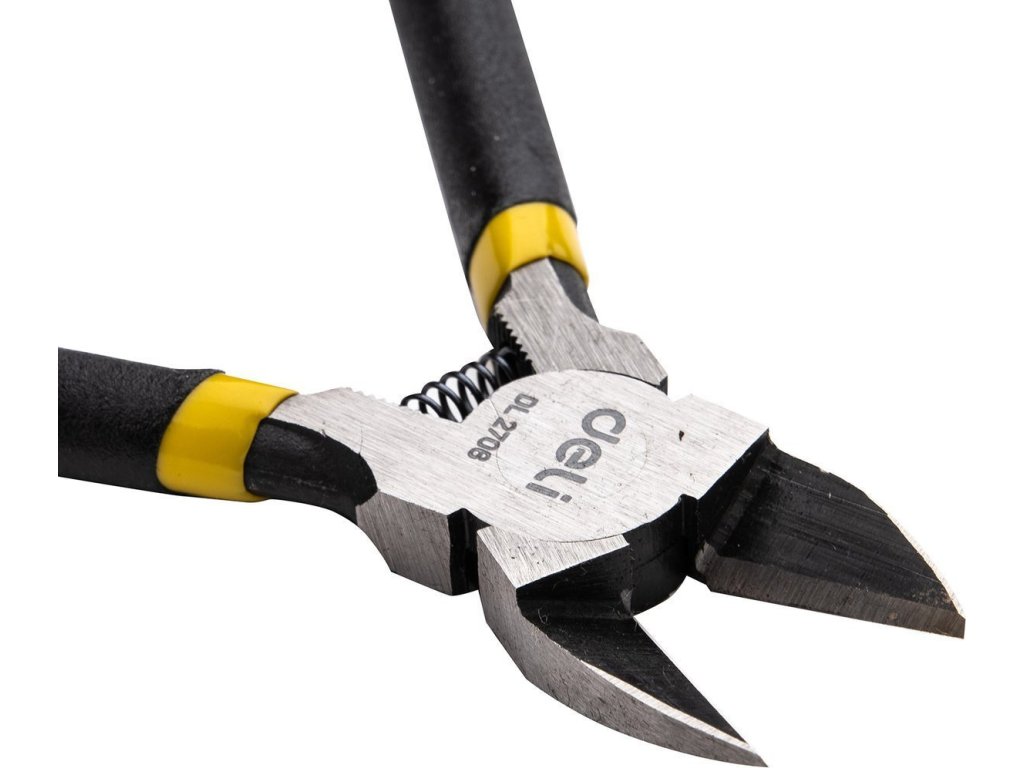 Profesionální, univerzální boční štípací kleště značky Deli v černé barvě, doporučené i pro náročné uživatele. Rukojeť byla potažena speciálním, na dotek příjemným plastem, takže nástroj nevyklouzne z ruky. Kleště jsou vyrobeny z uhlíkové oceli, která zajišťuje přesné a snadné stříhání. Tvrdost kleští EDL2706 je 56-60HRC, takže s nimi snadno přestřihnete například malé kabely. Výrobek má také zabudovanou prodlužovací pružinu, díky které je jeho používání ještě pohodlnější.
