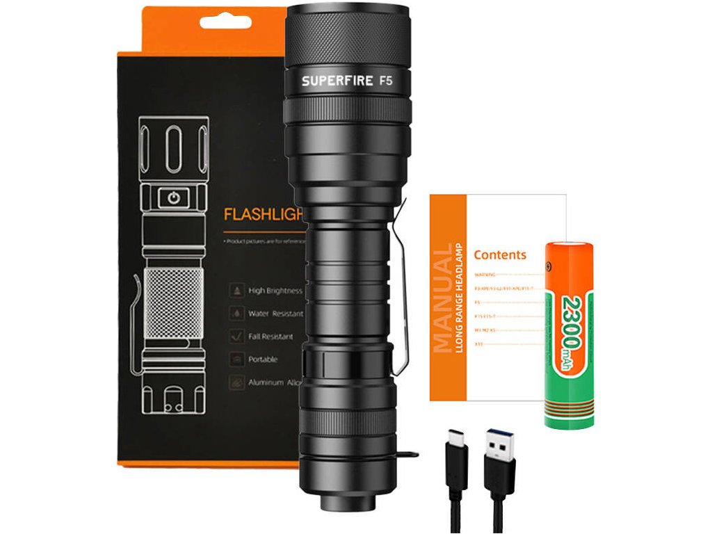 Praktická svítilna Superfire F5 zaujme svými rozsáhlými možnostmi. Díky variabilní ohniskové vzdálenosti bude fungovat téměř v každé situaci - dokáže vyzařovat jak zaostřené, tak rozptýlené světlo. Svítí výkonem až 10 W a její dosvit dosahuje až 236 m. Snadno se používá a nabízí 5 provozních režimů, toto zařízení je navíc mimořádně lehké - váží pouhých 100 g.
