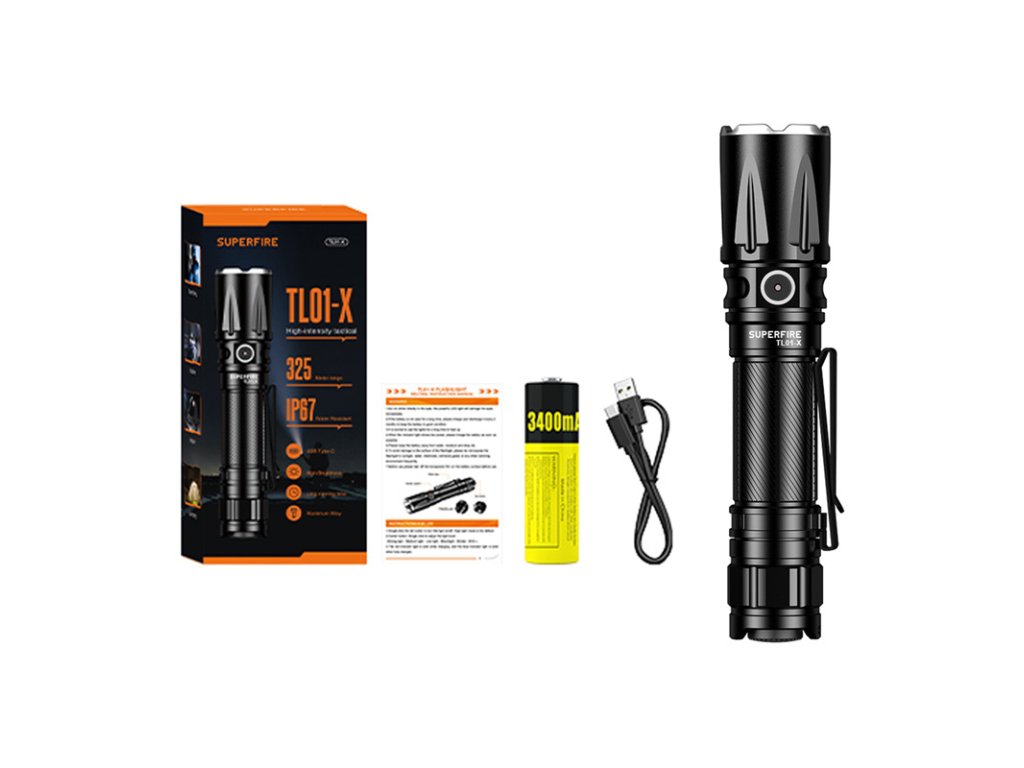 Svítilna Superfire TL01-X je odolný a kompaktní model s výkonem 20 W a jasem až 1800 lumenů, určený pro náročné taktické aplikace a každodenní použití. Dosvit až 325 metrů umožňuje efektivně osvětlit velké prostory a pevné pouzdro z hliníkové slitiny v kombinaci s krytím IP67 zajišťuje spolehlivý provoz i v náročném terénu a za nepříznivých povětrnostních podmínek.