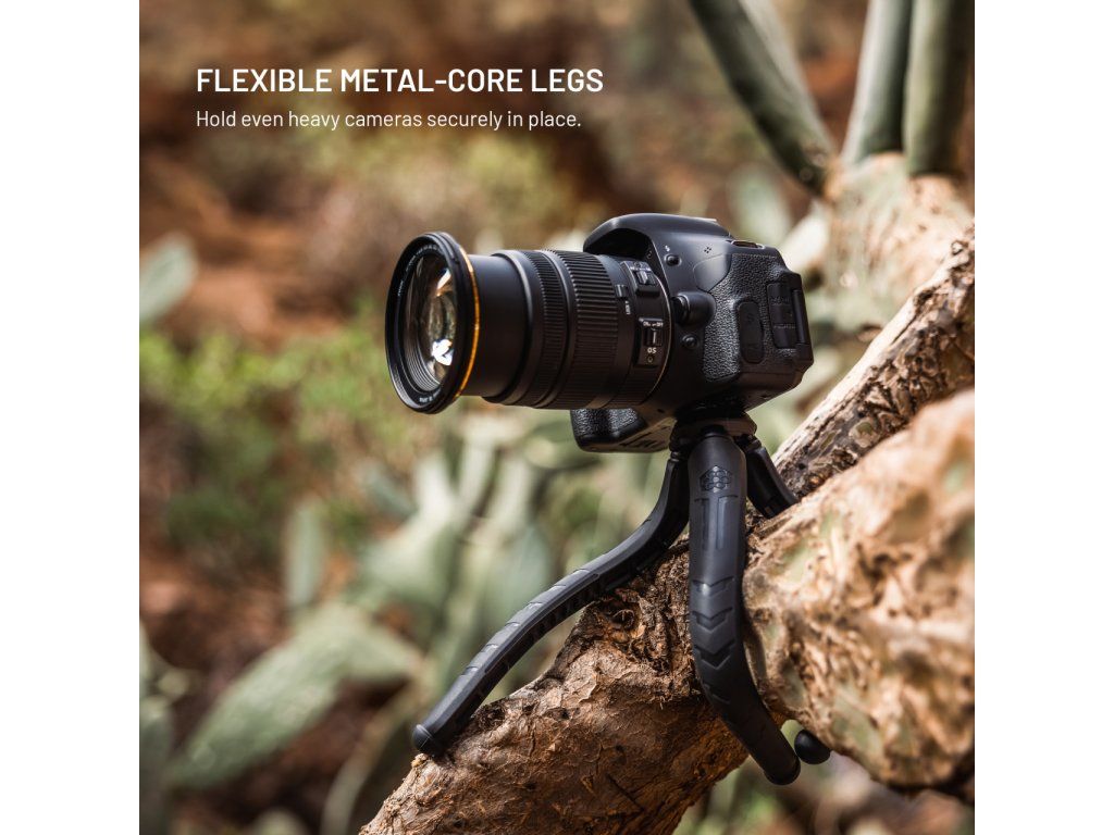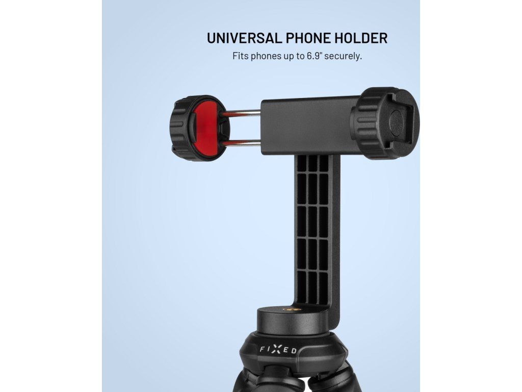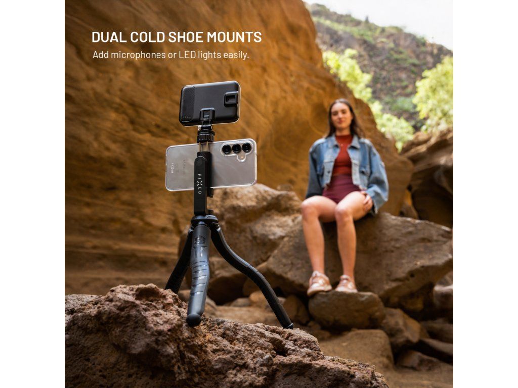 Flexibilní stativ FIXED Creator je ideální pomocník pro focení, natáčení i streamování kdekoli v terénu i doma. Jeho nohy, vyztužené sedmi ocelovými prameny, lze libovolně ohýbat nebo bezpečně omotat kolem větví, zábradlí či sloupků. Snadno tak získáte dokonalý záběr i na netradičních místech. Pogumovaný povrch zajišťuje maximální stabilitu a zabraňuje klouzání na hladkém povrchu. Součástí stativu je nastavitelný držák pro uchycení telefonů do velikosti 6,9"", které před poškrábáním chrání vnitřní polstrování kleští. Díky otočnému kloubu lze nastavit držák do horizontální i vertikální pozice pro ten nejlepší úhel. Držák je zároveň doplněn o dva praktické cold shoe adaptéry k uchycení mikrofonu nebo LED světla. Po odejmutí držáku můžete využít univerzální 1/4"" závit pro přichycení kompatibilních fotoaparátů, akčních kamer či dalšího příslušenství. Kompaktní rozměry a nízká hmotnost z něj dělají univerzální stativ pro každého, kdo chce tvořit kreativní záběry kdekoliv a bez omezení.