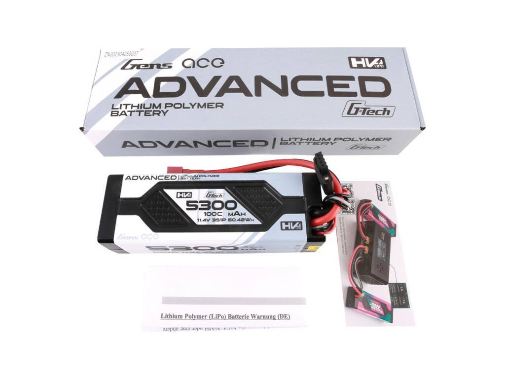 Gens ace Advanced G-Tech 5300mAh 11,4V 3S1P 100C HV auto Lipo batéria Hardcase s Deansovou zástrčkou (model GEA533S100DGT) je vysoko pokročilý zdroj energie určený pre modelárske aplikácie, kde je kľúčová spoľahlivosť a výkon. Článok Lipo s kapacitou 5300 mAh a napätím 11,4 V poskytuje vysokú energetickú účinnosť pre dlhé jazdy bez nutnosti častého nabíjania. Maximálne kontinuálne vybíjanie 100C ponúka okamžitý prísun energie, čo je dôležité pre pretekanie a intenzívnu jazdu. Pevné puzdro batérie chráni jej vnútro pred mechanickým poškodením a vonkajšími vplyvmi, čo výrazne predlžuje jej životnosť. Vďaka hmotnosti 376 ga rozmerom 137 × 46 × 37 mm sa ľahko inštaluje a je kompatibilný s väčšinou RC modelov. Zástrčka Deans navyše zaručuje pevné a bezpečné pripojenie na napájanie vozidla.