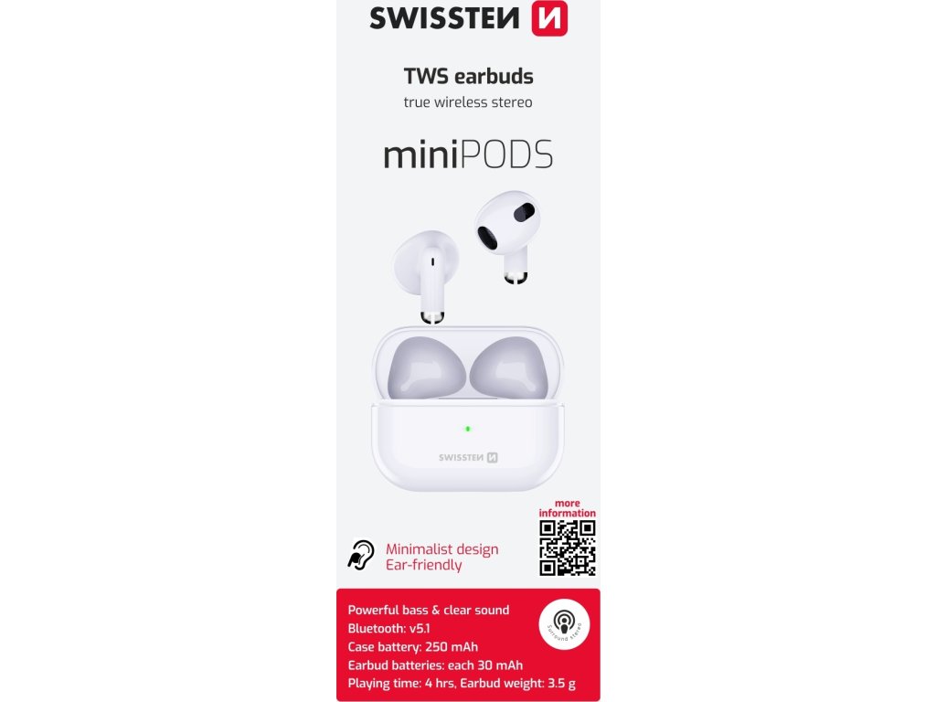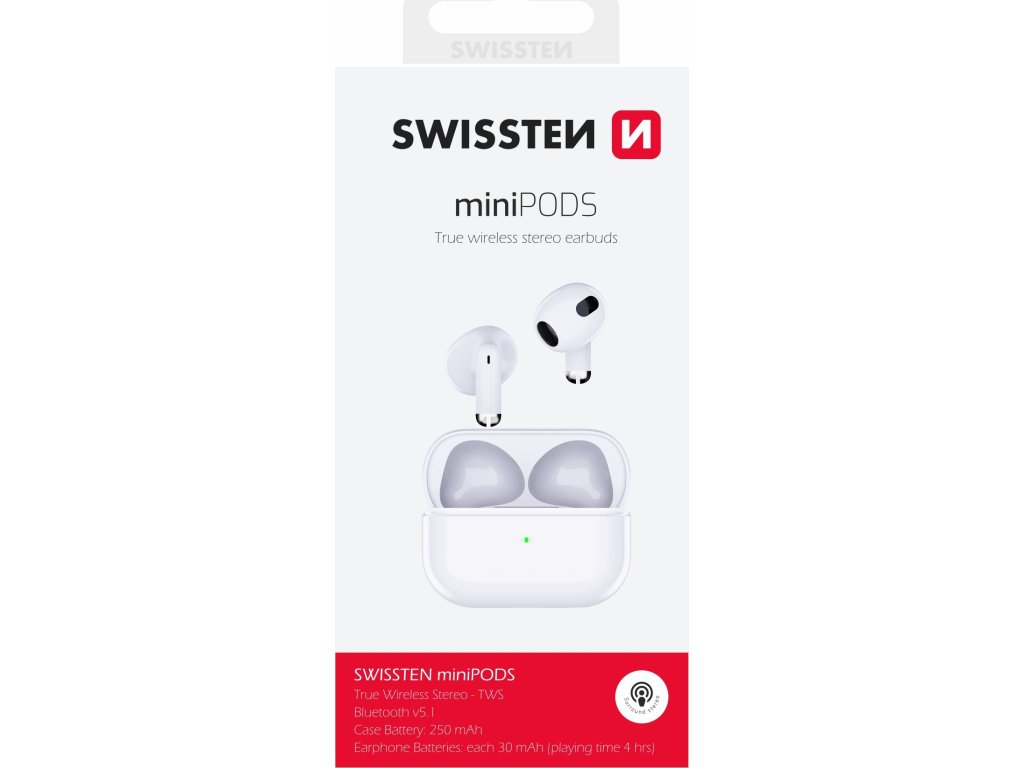 Elegantné bluetooth TWS slúchadlá SWISSTEN miniPODS pre počúvanie hudby s integrovaným mikrofónom pre uskutočnenie hovoru. Balené v blistri SWISTEN.