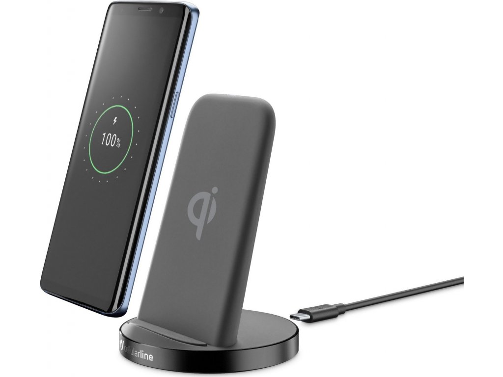 Stojanček pre bezrátové nabíjanie Cellularline Wireless Fast Charger Stand + Fast Charge adaptér 10W, Qi štandard, čierny