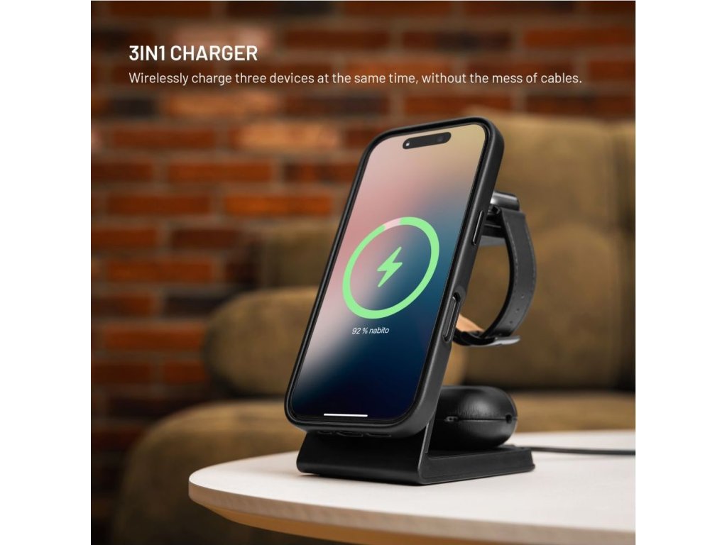 Bezdrôtová nabíjačka v minimalistickom dizajne, ktorá dokáže súčasne nabíjať telefón, bezdrôtové slúchadlá a hodinky.