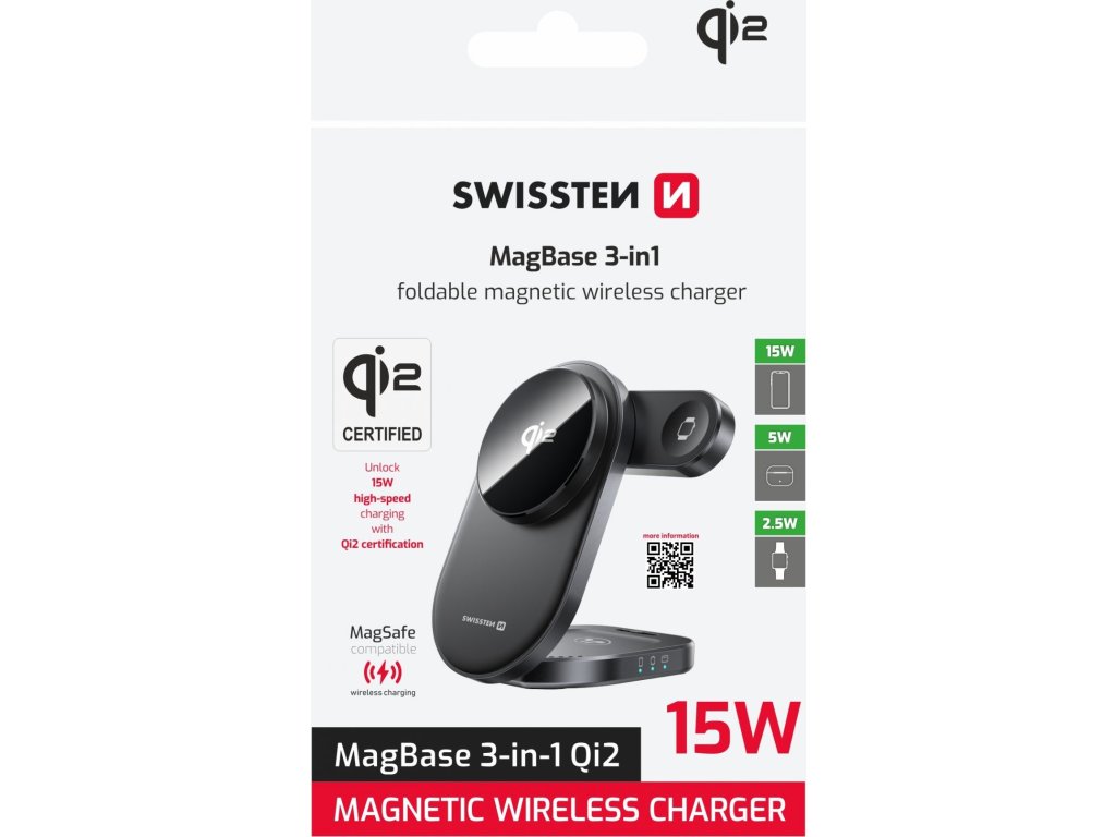 S bezdrôtovou skladacou nabíjačkou SWISSTEN MagBase 3v1 získate elegantné a praktické riešenie na nabíjanie iPhonu, Apple Watch a slúchadiel súčasne – bez káblov, bez neporiadku. Vďaka technológii Qi2 a magnetickému vystredeniu ponúka perfektné zarovnanie a až 15W bezdrôtový výkon pre iPhony. Kompaktné telo s matne čiernym povrchom, LED indikátory a skladacou konštrukciou z nej robia ideálny doplnok na stôl aj na cesty.