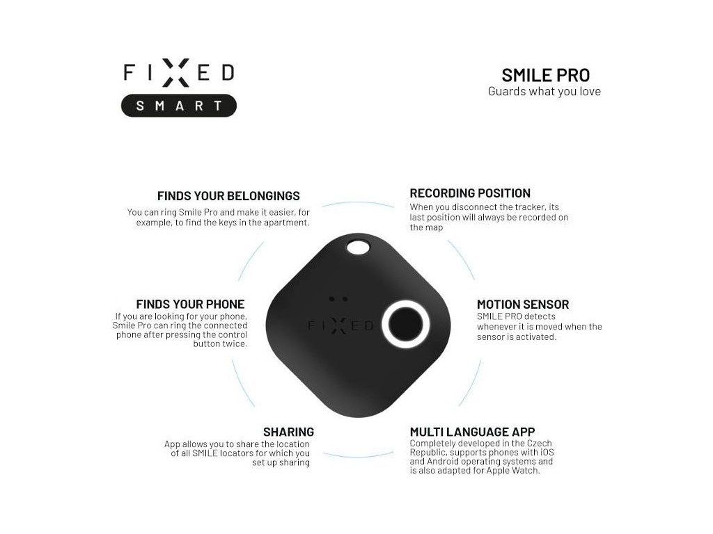 - pomôže nájsť stratenú vec - pomocou aplikácie FIXED Smart v telefóne prezvoníte váš Smile PRO