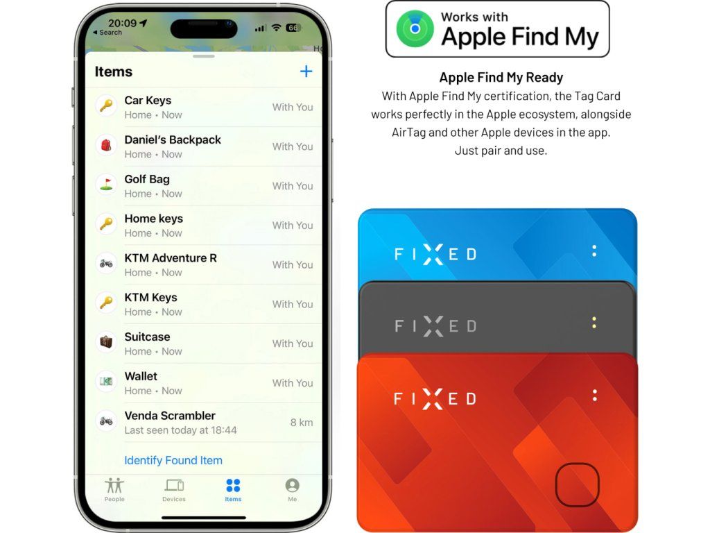Vďaka Apple Find My certifikácii si Tag Card jednoducho napárujete s vašim iPhonom alebo iným iOS zariadením. V aplikácii Nájsť potom funguje rovnako spoľahlivo ako AirTag alebo vaše ďalšie Apple zariadenia. Tag Card oznamuje svoju polohu prostredníctvom signálu Bluetooth a všetky blízke zariadenia v sieti Nájsť následne odovzdávajú polohu lokátora do iCloudu, aby ste mohli všetky informácie zobraziť na mape v aplikácii. Váš FIXED Tag Card bude vždy v bezpečí a pod dohľadom miliónov Apple používateľov po celom svete. Súkromie používateľov je chránené pomocou zašifrovania, všetky údaje o polohe Tag Card sú anonymné.