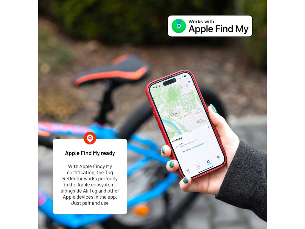 Vďaka Apple Find My certifikácii si Tag Reflector jednoducho napárujete s vašim iPhonom alebo iným iOS zariadením. V aplikácii Nájsť potom funguje rovnako spoľahlivo ako AirTag alebo vaše ďalšie Apple zariadenia. Tag Reflector oznamuje svoju polohu prostredníctvom signálu Bluetooth a všetky blízke zariadenia v sieti Nájsť následne odovzdávajú polohu lokátora do iCloudu, aby ste mohli všetky informácie zobraziť na mape v aplikácii. Váš FIXED Tag Reflector bude vždy v bezpečí a pod dohľadom miliónov Apple užívateľov po celom svete. Súkromie užívateľov je chránené pomocou zašifrovania, všetky dáta o polohe Tag Reflector sú anonymné.