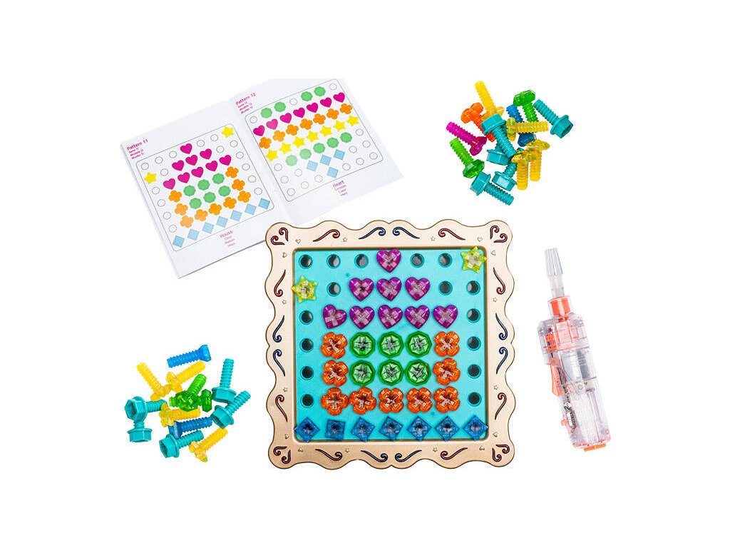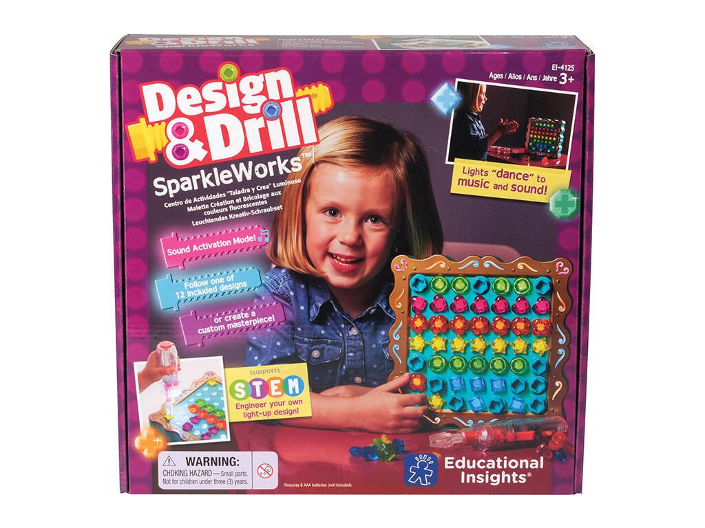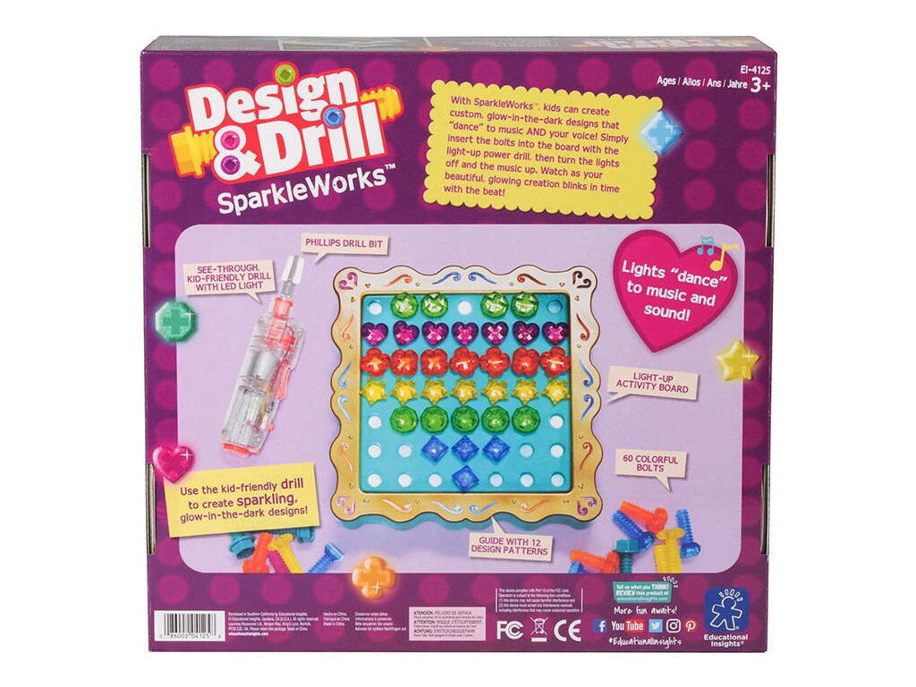 Nechajte svoje dieťa prebudiť v sebe umelcov a rozvíjať kreativitu pri zábave! Súprava Design & Drill Sparkleworks od spoločnosti Learning Resources obsahuje osvetlenú tabuľu a 60 farebných skrutiek, ktoré je možné zaskrutkovať a vyskrutkovať pomocou deťom vhodnej hračkovej vŕtačky/skrutkovača. Súčasťou balenia je aj brožúra s 12 návrhmi na dizajn - malí užívatelia sa jej môžu inšpirovať alebo prísť s vlastnými nápadmi! Hotová kompozícia navyše svieti v tme a bliká do rytmu hudby. To všetko umožňuje rozvíjať predstavivosť a precvičovať manuálnu zručnosť a zároveň zaručuje skvelú zábavu. Výrobok je vhodný pre deti od 3 rokov.