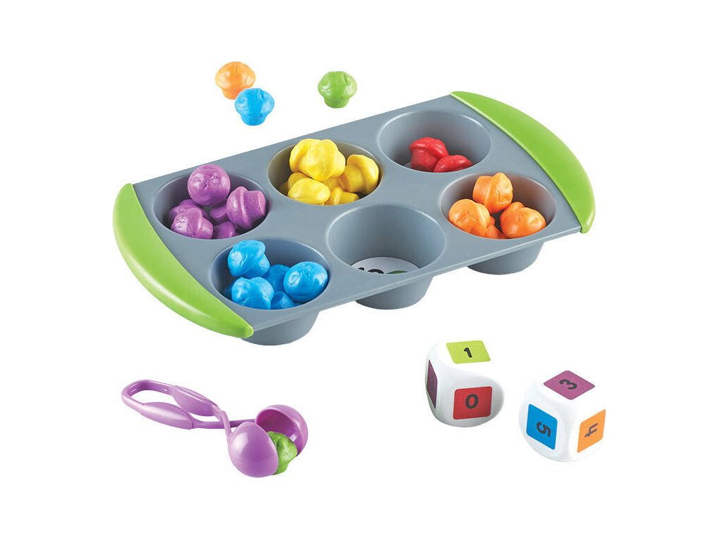 Súprava Mini Muffin Match Up tiež uľahčuje výučbu počítania. Môžete napríklad hádzať kockami s číslami a farbami a potom podľa toho, čo vypadne, povedať dieťaťu, aby vám dalo správny počet muffinov v určitej farbe. Dobré je tiež vymýšľať krátke príbehy, napríklad: „Mám 2 žlté muffiny a mamička mi dala 2 zelené“ – úlohou dieťaťa bude spočítať, koľko muffinov dohromady. Čo ďalšie si môžete zahrať? Položte všetky muffiny na tácku a hoďte kockou s číslami - podľa toho, aké číslo vypadne, požiadajte dieťa, aby pinzetou vybralo zodpovedajúci počet predmetov. Týmto spôsobom si nielen precvičíte počítanie, ale aj zapracujete na manuálnej zručnosti!