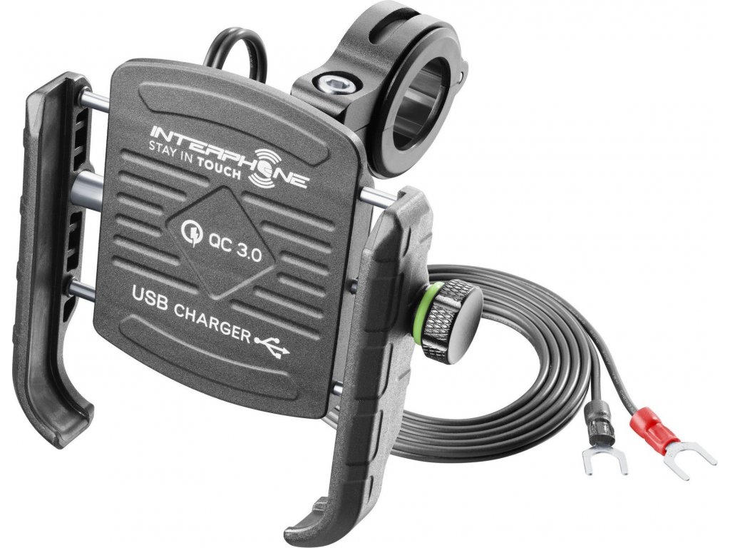Univerzálny držiak mobilného telefónu na motocykel Interphone Motocrab je ideálnym doplnkom pre bezpečné používanie vášho telefónu počas jazdy. Odolná konštrukcia držiaka poskytne bezpečie pre akýkoľvek telefón so šírkou 60 - 88 mm. Stačí vložiť telefón do držiaka a utiahnuť postranné kliešte pomocou skrutkovacieho mechanizmu. Pre ešte lepšie uchytenie telefónu môžete použiť aj gumovú poistku, ktorá dodatočne zaistí vložené zariadenie. Vďaka zabudovanému USB portu môžete pomocou nabíjacieho kábla pripojiť váš telefón k držiaku a pohodlne nabíjať počas jazdy. Inštalácia je jednoduchá a rýchla, držiak Interphone je vhodný pre všetky riadidlá s priemerom 22 - 32 mm.