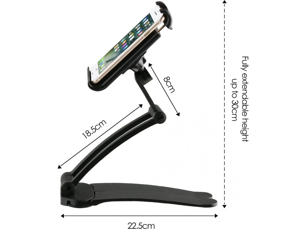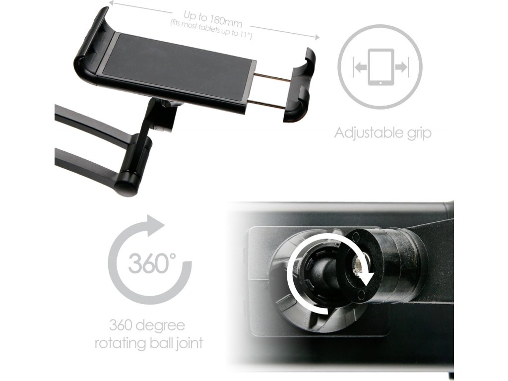 Desire2 predstavjue univerzálny a praktický stojan pre váš tablet. Kombinácia čierneho brúseného hliníka a ergonomického dizajnu zo stojanu Desire2 luxusný doplnok domov aj do kancelárie. Základňa stojanu zaistí pevnú stabilitu, stačí roztvoriť nohy stojanu a nastaviť držiak do požadovanej polohy. Ďalšou možnosťou uchytenia je pripevniť stojan na stenu pomocou pribaleného nástavca. Otočné ramená držiaka idú nastaviť do ľubovoľnej polohy, vrchná časť s kliešťami na tablet sa otáča o 360 °. Maximálne rozpätie klieští je 18 cm. Pre úplné bezpečie vášho tabletu sú kliešte držiaka pokryté silikónovými podložkami.