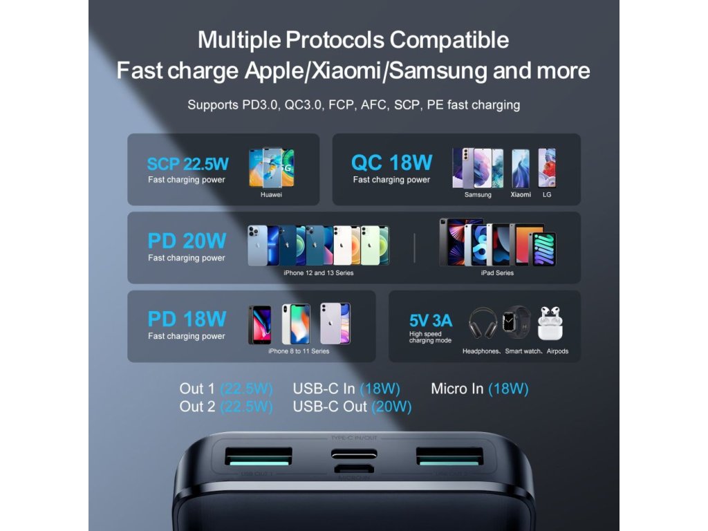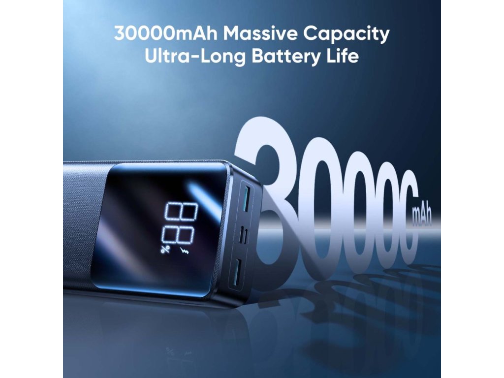 JR-QP 193 je kompaktná verzia Powerbanky od značky Joyroom s kapacitou 30000mAh/22,5W. Zariadenie podporuje protokoly rýchleho nabíjania PD3.0, QC3.0, AFC, FCP, SCP a PE. Vybavené štyrmi portami – dvoma portami USB-A a jedným portom USB-C a Micro-USB. Posledné dva slúžia tiež na nabíjanie powerbanky.