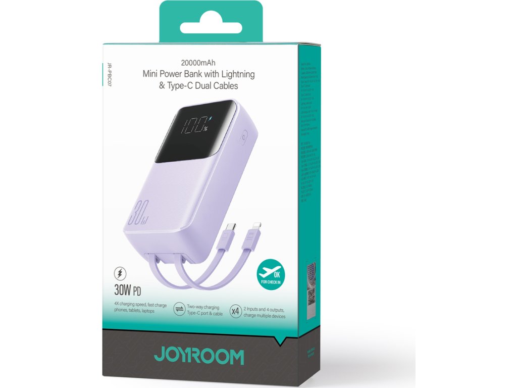 Mini powerbanka Joyroom JR-PBC07 s kapacitou 20 000 mAh a výkonom až 30 W so vstavanými káblami USB-C a Lightning - fialová
