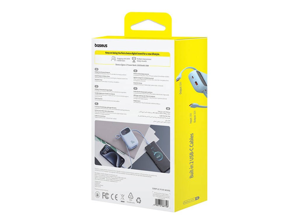 Baseus QPow 2 umožňuje nabíjať až štyri zariadenia súčasne vďaka vstavaným USB-C káblom a ďalším USB portom. Táto funkcia je ideálna pre tých, ktorí potrebujú nabíjať niekoľko zariadení naraz, ako je smartphone, tablet, bezdrôtové slúchadlá alebo chytré hodinky. To všetko je možné vďaka pokročilým protokolom rýchleho nabíjania, ako sú PD3.0, QC3.0, SCP a ďalšie.