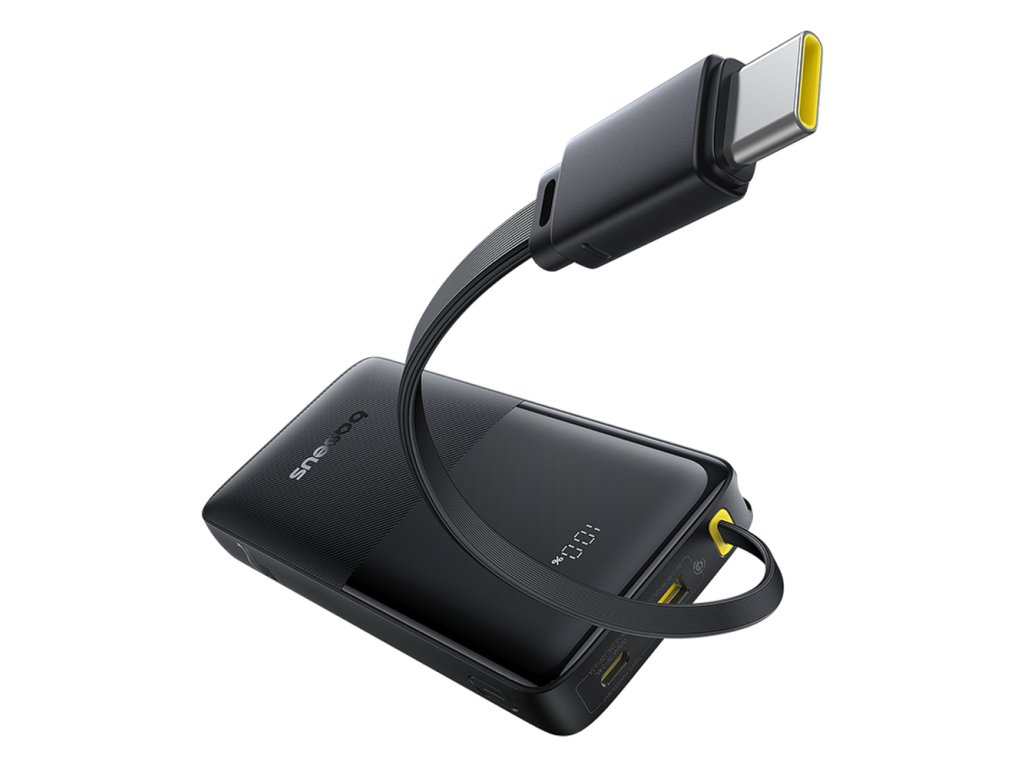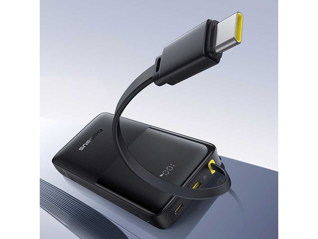 Baseus Bipow 2 má integrovaný kábel USB-C, ktorý umožňuje okamžité nabíjanie bez nutnosti hľadania ďalších káblov. Je to praktické riešenie, ktoré šetrí čas a miesto vo vašej taške.