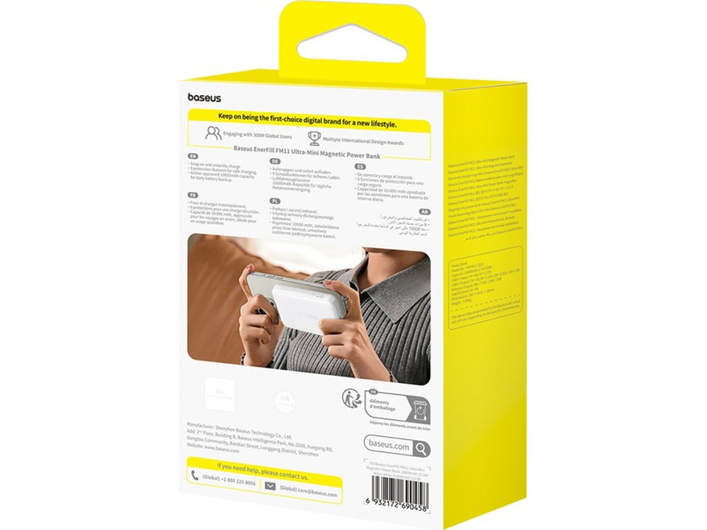 Baseus EnerFill FM11 je kompaktná powerbanka s kapacitou 10 000 mAh, ktorá kombinuje vysoký výkon, bezpečnosť a ultraprenosný dizajn. Technológia MagSafe a magnety N52 umožňujú rýchle a pohodlné nabíjanie – na nabitie zariadenia stačí jedno kliknutie. Podporuje rýchle káblové nabíjanie až do 22,5 W (PD 20 W pre iPhone, QC 22,5 W pre Android) a bezdrôtové nabíjanie až do 15 W. Nabíjanie počas používania poskytuje pohodlie, zatiaľ čo inteligentný systém NTC monitoruje teplotu a zaisťuje stabilnú a bezpečnú prevádzku. Súčasťou balenia je 30 cm kábel Baseus Simple USB-C 20V/3A.