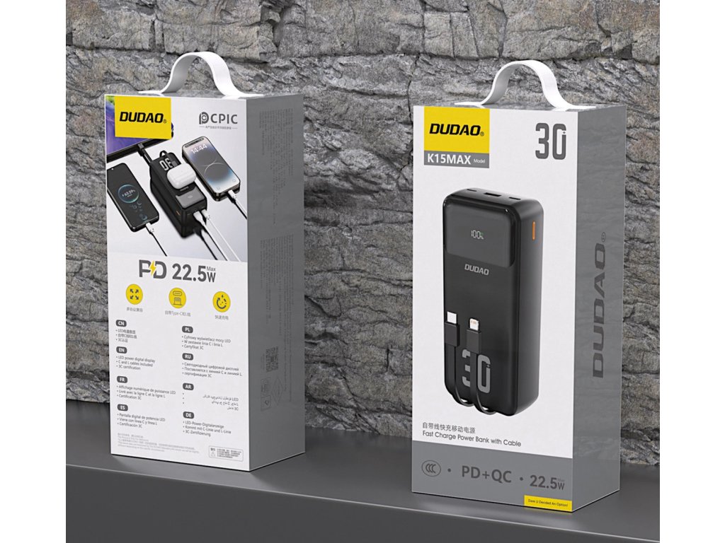Dudao K15MAX 30000mAh PD 22,5W powerbanka so vstavanými káblami - čierna