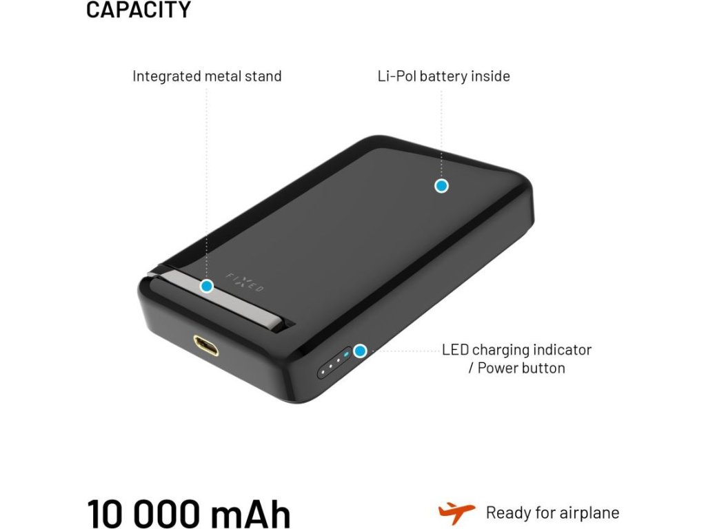 Kompaktná powerbanka FIXED MagZen 10 Pro s kapacitou 10 000 mAh a certifikáciou Qi2 prináša rýchle a efektívne nabíjanie všetkých telefónov s podporou tejto technológie. Bezdrôtovo nabíja výkonom až 15 W a vďaka integrovaným MagSafe magnetom ju možno pevne prichytiť na chrbát telefónu iPhone 12 a novších. Pokiaľ váš telefón MagSafe nepodporuje, môžete nabíjaciu plochu powerbanky využiť ako bezdrôtovú nabíjaciu podložku. USB-C port ponúka nabíjanie výkonom až 30 W alebo nabíjanie dvoch zariadení súčasne cez USB-C port (10 W) a bezdrôtovo (5 W). Tlačidlo s LED diódami prehľadne zobrazuje stav nabitia powerbanky a štvrtá dióda signalizuje, že nabíjanie prebieha. Samotná powerbanka je dobíjaná prostredníctvom USB-C portu výkonom 18 W a môže byť dobíjaná počas bezdrôtového nabíjania telefónu. Súčasťou powerbanky je praktický sklopný stojan, vďaka ktorému je možné pohodlne sledovať obrazovku aj počas nabíjania, a to vo vertikálnej alebo horizontálnej polohe. Elegantné telo s lesklým povrchom má nabíjaciu stranu opatrenú jemným silikónom na ochranu telefónu pred poškriabaním. Štýlová powerbanka vo vreckovej veľkosti je ideálnym spoločníkom na cesty aj každodenné použitie.