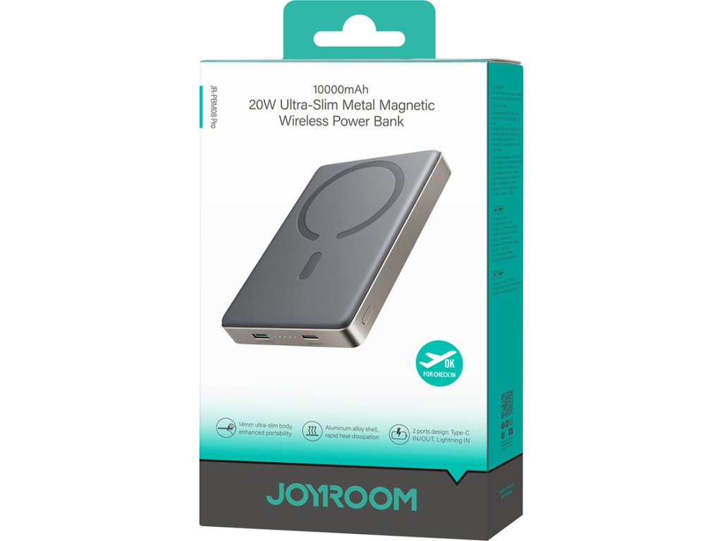Powerbanka Joyroom JR-PBM08 Pro je perfektným riešením pre ľudí, ktorí si cenia moderné technológie a spoľahlivosť. S kapacitou 10 000 mAh a funkciou rýchleho nabíjania PD 20W poskytne potrebnú energiu pre vaše zariadenia, nech ste kdekoľvek. Bezdrôtové nabíjanie 15W a možnosť nabíjať dve zariadenia súčasne z nej robia produkt vytvorený s ohľadom na multitasking. Výnimočne štíhly dizajn, porovnateľný s veľkosťou malej karty, zaručuje pohodlie pri používaní a jednoduchú prenosnosť. Silný magnetický modul zaisťuje bezpečné pripojenie k telefónu a LED diódy umožňujú neustále sledovať stav nabitia. Vyberte si Joyroom JR-PBM08 Pro a užívajte si plný komfort a efektivitu, nech ste kdekoľvek!