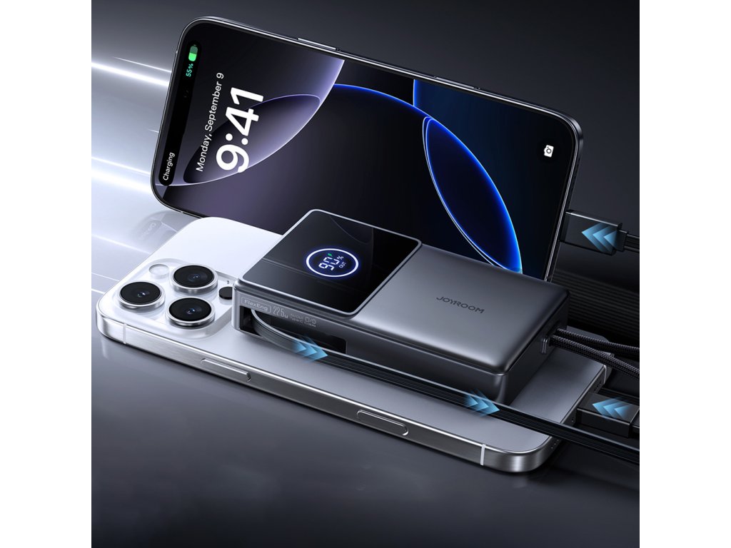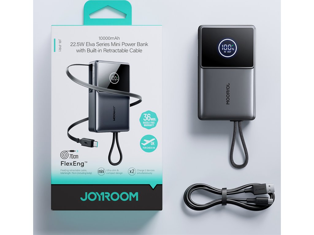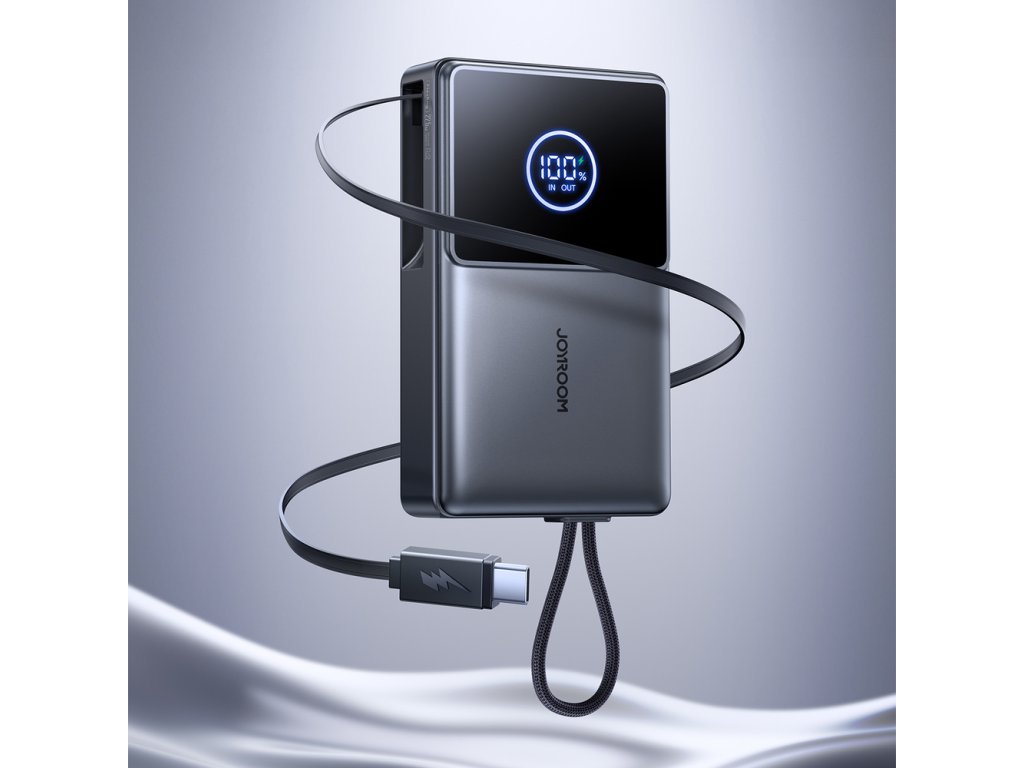 Powerbanka Joyroom JR-PR1 je kompaktný a neuveriteľne praktický zdroj energie, ktorý je ideálny pre každú situáciu – od cestovania, cez každodenné dochádzanie až po rušný deň v práci. Vďaka vstavanému 70 cm dlhému káblu USB-C s navíjacím mechanizmom a 7-polohovým zámkom eliminuje problémy so zamotaním káblov a umožňuje pohodlné nabíjanie bez ďalšieho príslušenstva. S kapacitou 10 000 mAh poskytuje niekoľko plných nabití smartfónu a s výkonom 22,5 W podporuje rýchle nabíjanie v oboch smeroch – pre zariadenia aj samotnú powerbanku. Digitálny displej zobrazuje úroveň nabitia a prevádzkový stav v reálnom čase, čo vám dáva plnú kontrolu nad vašou energiou. Joyroom JR-PR1 podporuje populárne protokoly rýchleho nabíjania (PD, QC3.0, Huawei SCP/FCP, Samsung AFC), vďaka čomu je všestranným a spoľahlivým každodenným spoločníkom. Režim nízkeho prúdu vám navyše umožňuje nabíjať menšie zariadenia, ako sú slúchadlá alebo fitness náramky.
