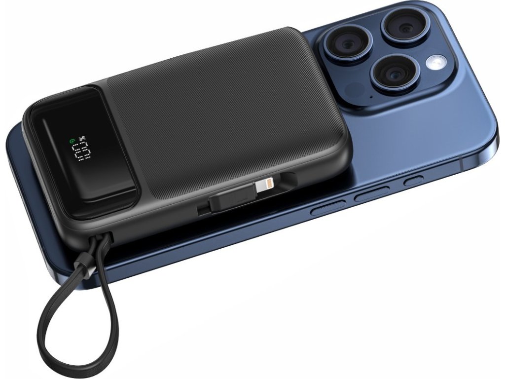Keďže má powerbanka integrované káble s koncovkami USB-C a Lightning už naďalej nebudete musieť riešiť akékoľvek káble. Powerbanku pomocou USB-C koncovky aj nabijete.